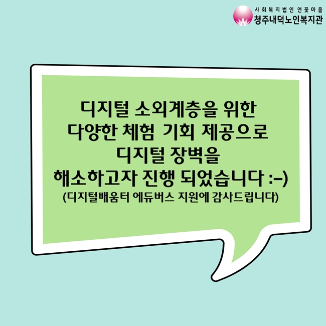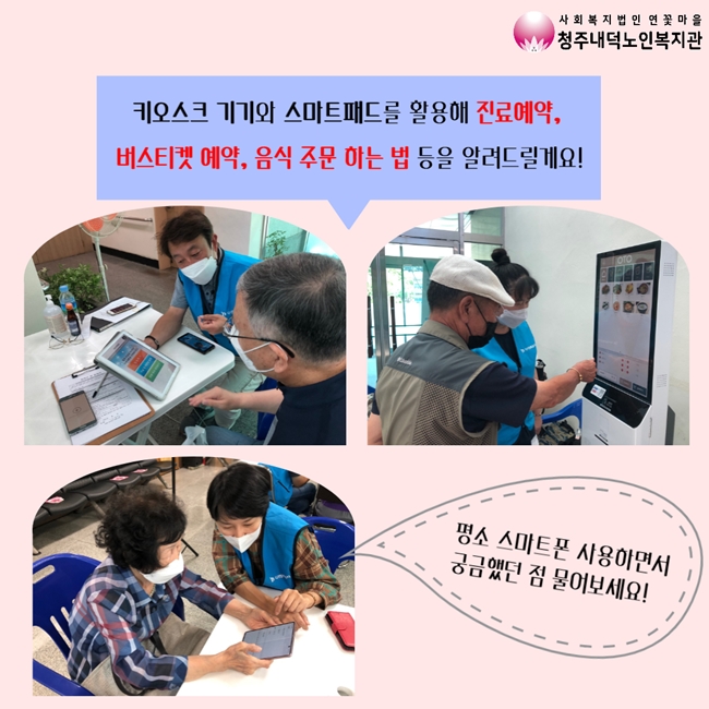 7월 27일(화) 9:00~16:00 미디어 체험 기회를 제공 하였습니다! 이번 미디어 체험에는 키오스크, 스마트패드, AI 스피커, 스마트폰 저장공간 관리, 평소 스마트폰 사용 시 궁금했던 점에 대해 알아볼 수 있도록 지원 해드렸습니다~! 이번 참여를 통하여 조금이나마 디지털 장벽 해소에 도움이 되었길 바랍니다!