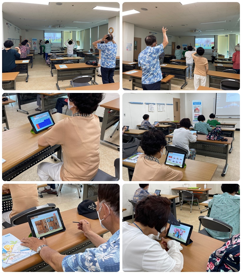 저희 복지관에서는 7. 29.(목) 14:00~15:00 복지관 2층 으뜸방에서 청원보건소 치매안심센터와 함께 찾아가는 치매예방인지강화교실 프로그램을 진행하였습니다~ 매 회기 진행한 치매예방체조와 함께 웹-코트를 활용했던 저번과 달리, ‘배러코그’프로그램을 활용하여 어르신들의 인지활동을 통해 치매예방에 도움을 주는 활동을 하였습니다! 주 내용은 일치하는 그림찾기, 틀린그림찾기, 숨은그림찾기 등으로 진행되었습니다. 새로운 프로그램에 어르신들이 호기심을 갖고 적극적으로 참여해 주셨습니다!! 다음 회기에도 배러코그 프로그램을 통해 진행 할 예정이며, 다음 마지막 시간까지 어르신들에게 유익한 시간이 되었으면 좋겠습니다~~!! 더운 날씨에도 참여해주신 어르신들 모두 고생 많으셨습니다!^^