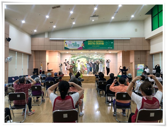 지난 7일, 복지관 강당에서 코로나블루로 정신적 스트레스가 심화되는 이용어르신을 위한 힐링공연이 진행되었습니다. 6월 첫번째 연극공연에 이어 마련된 이번 공연에는 대전지역을 연고로 활발하게 활동하는 메타댄스프로젝트 무용단이 무대를 꾸며 주셨습니다. 메타댄스프로젝트팀은 2001년 창단한 현대무용단으로 2020년 전국무용제에서 대통령상을 수상한 실력있는 팀으로 어렵게 모셨답니다. 전국 10개 기관 순회 공연의 첫번째 순서로 저희 복지관이 결정되어 어르신들에게 국악과 이솝우화, 우리춤 을 현대무용에 접목하여 어르신들도 쉽게 이해하고 즐길 수 있도록 무대를 준비해주셔서 어르신들의 큰 호응을 얻었습니다. 코로나19 방역수칙을 잘 지켜주신 참여어르신과 멋진 공연 선사해주신 메타댄스프로젝트 단원 여러분께 감사드립니다.