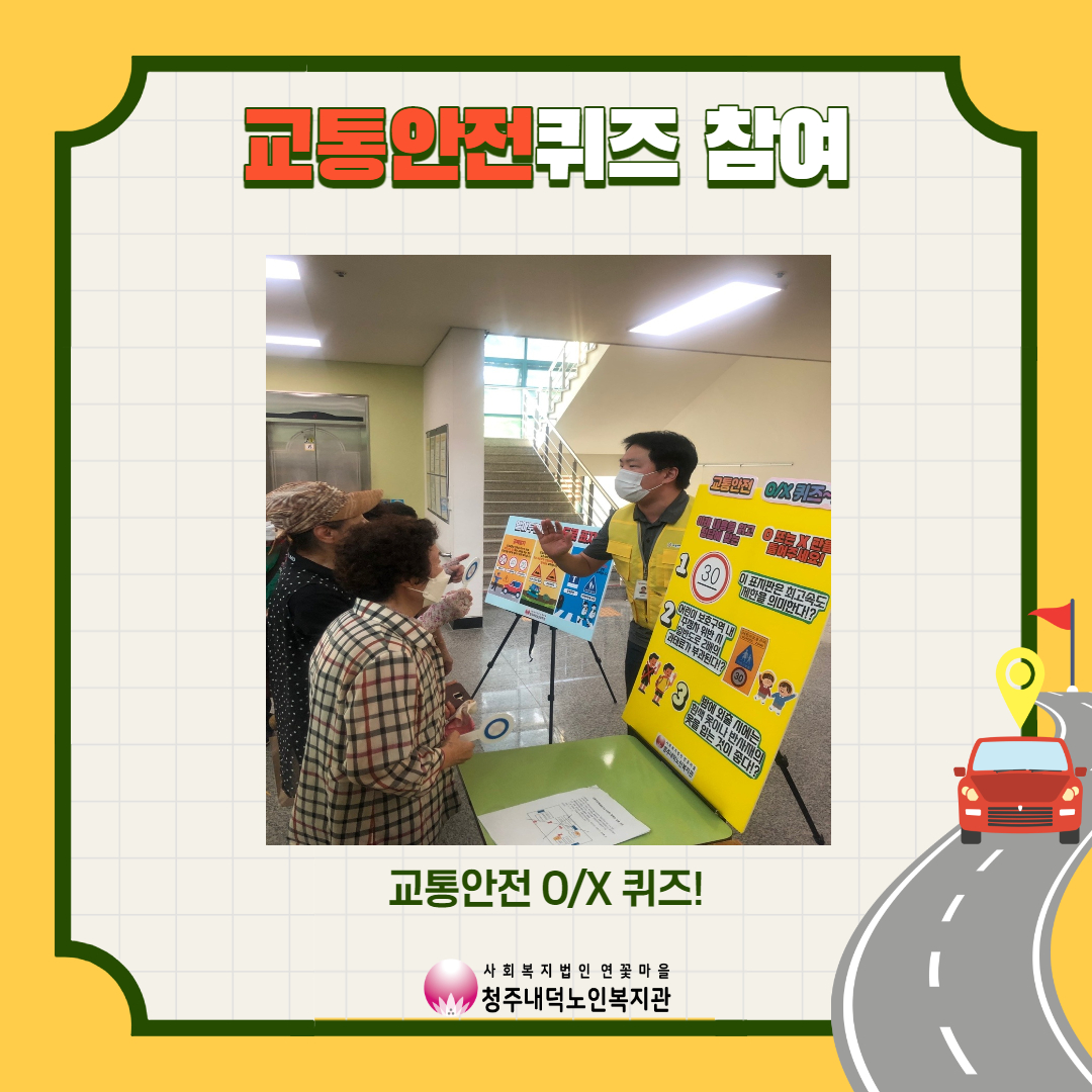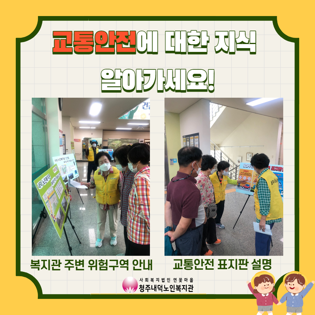 금일 저희 복지관에서는 13:00~15:00에 교통안전베테랑교실 교통안전 캠페인이 실시되었습니다! 교통안전베테랑교실 참여자들이 직접 2021 변경된 교통법규, 모니터링한 복지관 주변 위험지역, 교통안전표지판 설명 및 퀴즈 등을 복지관 이용자 어르신들에게 안내하여 교통안전지식을 전달하였습니다.