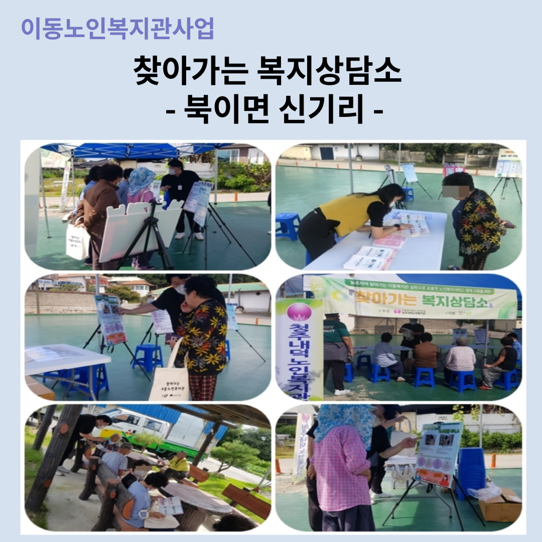 저희 복지관에서는 9월 24일(금) 14:00~16:30분까지 북이면 신기리마을 일대에서 찾아가는 복지상담소를 진행하였습니다~! 이번 복지상담소에서는 복지관 평생교육프로그램 운영 안내와 노인사회활동 지원사업 9988행복지키미 수요자 모집 안내, 저소득 어르신 신청 안내 등 전반적인 사업 안내를 실시하였으며 특히, 저소득 독거노인을 위한 복지관 재가서비스 안내 및 복지사각지대 발굴을 위한 재가복지캠페인을 실시하였습니다. 행사를 진행하면서 거리두기 안내 및 마스크 착용 안내 등 방역수칙을 준수하면서 행사를 진행하였습니다~! 농촌지역 어르신들과 지역주민들을 위해 매달 복지상담소는 청원구 농촌지역을 찾아가겠습니다~!