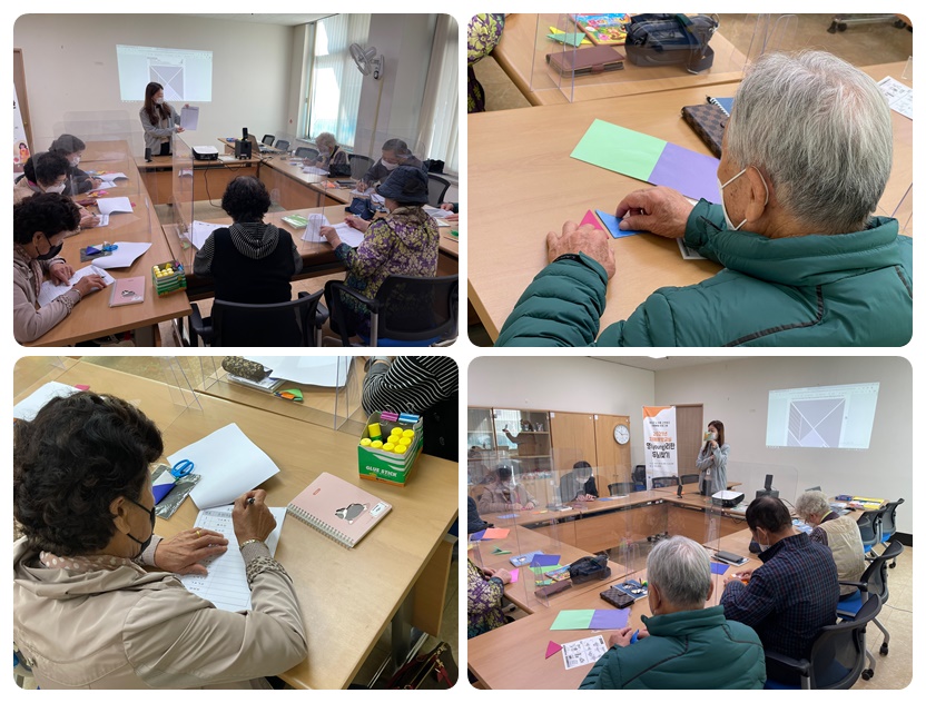 금일 저희 복지관에서는 10:00~11:00 1층 상담실에서 치매예방교실 8회기가 진행되었습니다! 이번 시간에도 마찬가지로 치매예방체조와 함께 수업을 시작했습니다. 또한 종이를 접어 칠교교구를 직접 만들고, 도안에 따라 모양을 만들어보는 시간을 가졌습니다. 그리고 음식과 관련된 초성퀴즈와 함께 여러 워크북을 통해 구성된 유인물을 함께 풀어보았습니다. 이번 유인물에는 계산력, 집중력 등을 활용하는 문제로 구성하였으며 회상 시간에는 자신의 연령대별로 어떤 활동을 주로 해봤었는지 떠올려보고 계획하는 시간을 가졌습니다.
