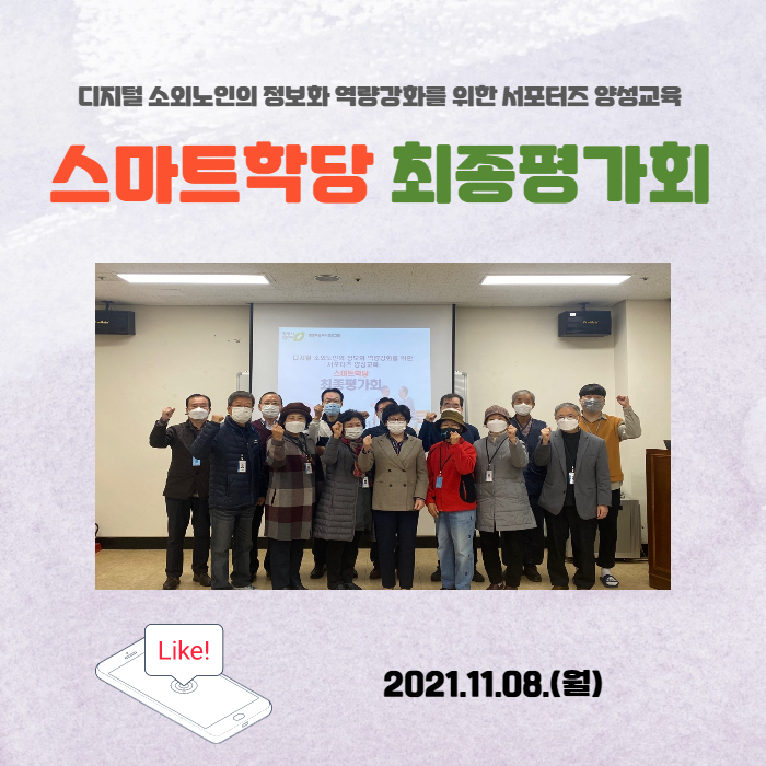 지난 4월부터 진행된 스마트학당은 디지털 소외노인의 정보화 역량강화를 위한 서포터즈 양성교육 과정으로 참여자들은 향후 디지털기기 교육에 있어 보조강사 및 동년배 서포터즈로 활동하게 됩니다. 아직 부족한 부분이 많지만 더욱 공부하여 디지털 소외노인들에게 도움이 될 수 있도록 하겠습니다. 많은 관심과 응원 부탁드립니다!