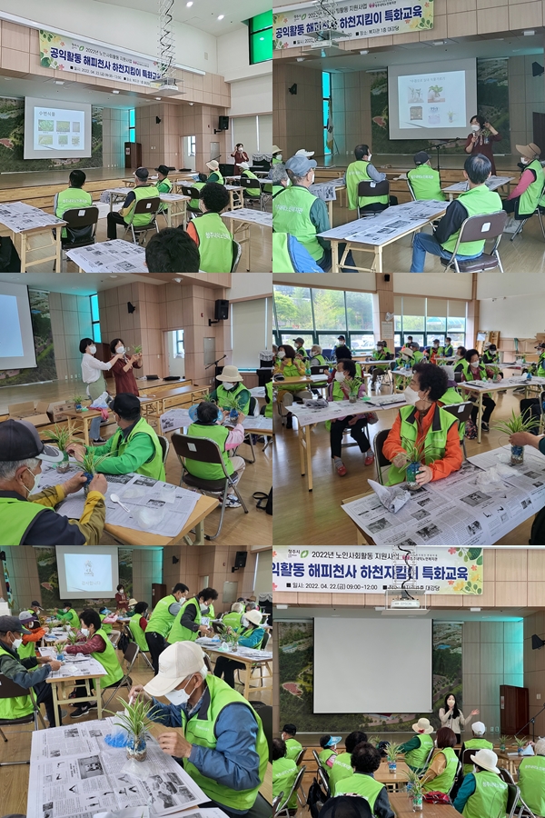 청주내덕노인복지관에서는 4월 22일 금요일 오전 9시부터 12시까지 3시간 동안 1층 대강당에서 해피천사 하천지킴이 참여자 40명을 대상으로 특화교육을 실시하였습니다.