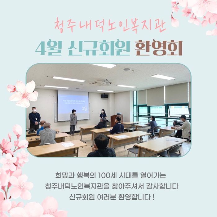 희망과 행복의 100세 시대를 열어가는 청주내덕노인복지관을 찾아주셔서 감사합니다~! 4월 신규회원 환영회는 4월 28일(목) 실시 하였으며 총 21명의 어르신을 대상으로 진행 되었습니다! 시설안내, 사업안내, 이용안내, 이용수칙 등 안내드렸으며 향후 기관 이용에 있어 궁금증을 해소해 드렸습니다 언제든지 문의 주시길 바라며 앞으로 많은 이용 바랍니다