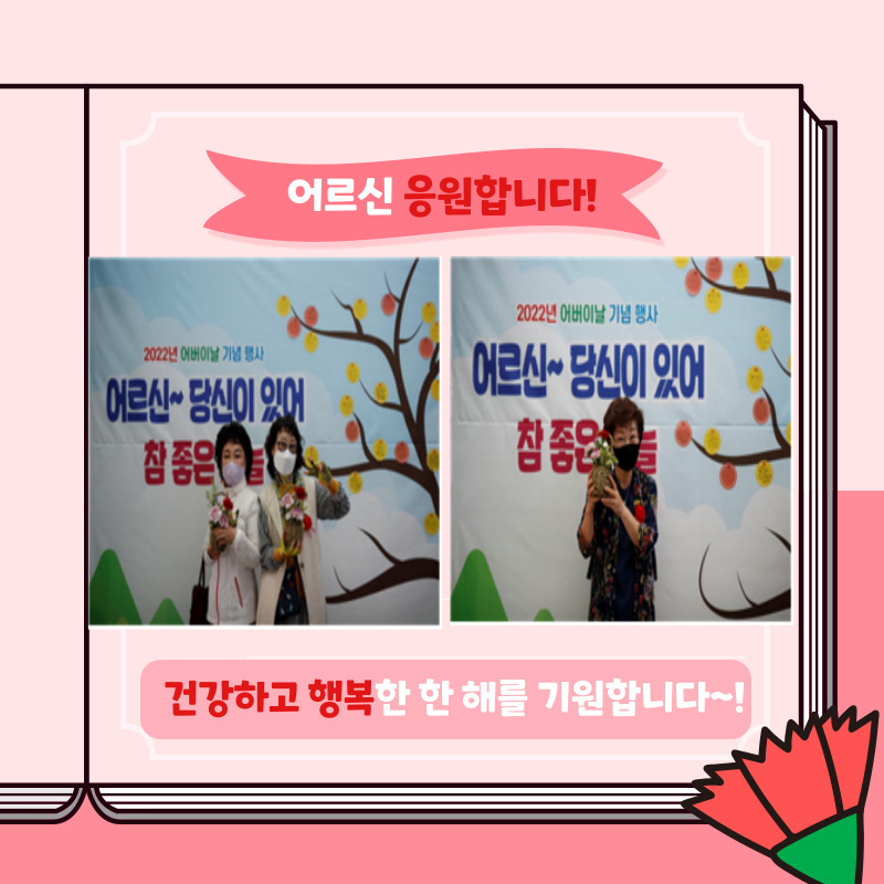 저희 복지관에서는 금일 어버이날 기념 행사를 실시하였습니다! 카네이션 달아드리기, 나를 위한 희망 메세지 적기, 기념품 증정 등 다채로운 행사가 진행되었습니다. 어르신들께서는 건강과 행복, 그리고 코로나19 이전의 일상을 위한 소망을 담아 희망 메세지를 작성하며 뜻 깊은 시간을 보냈다며 즐거워하셨습니다^^!!
