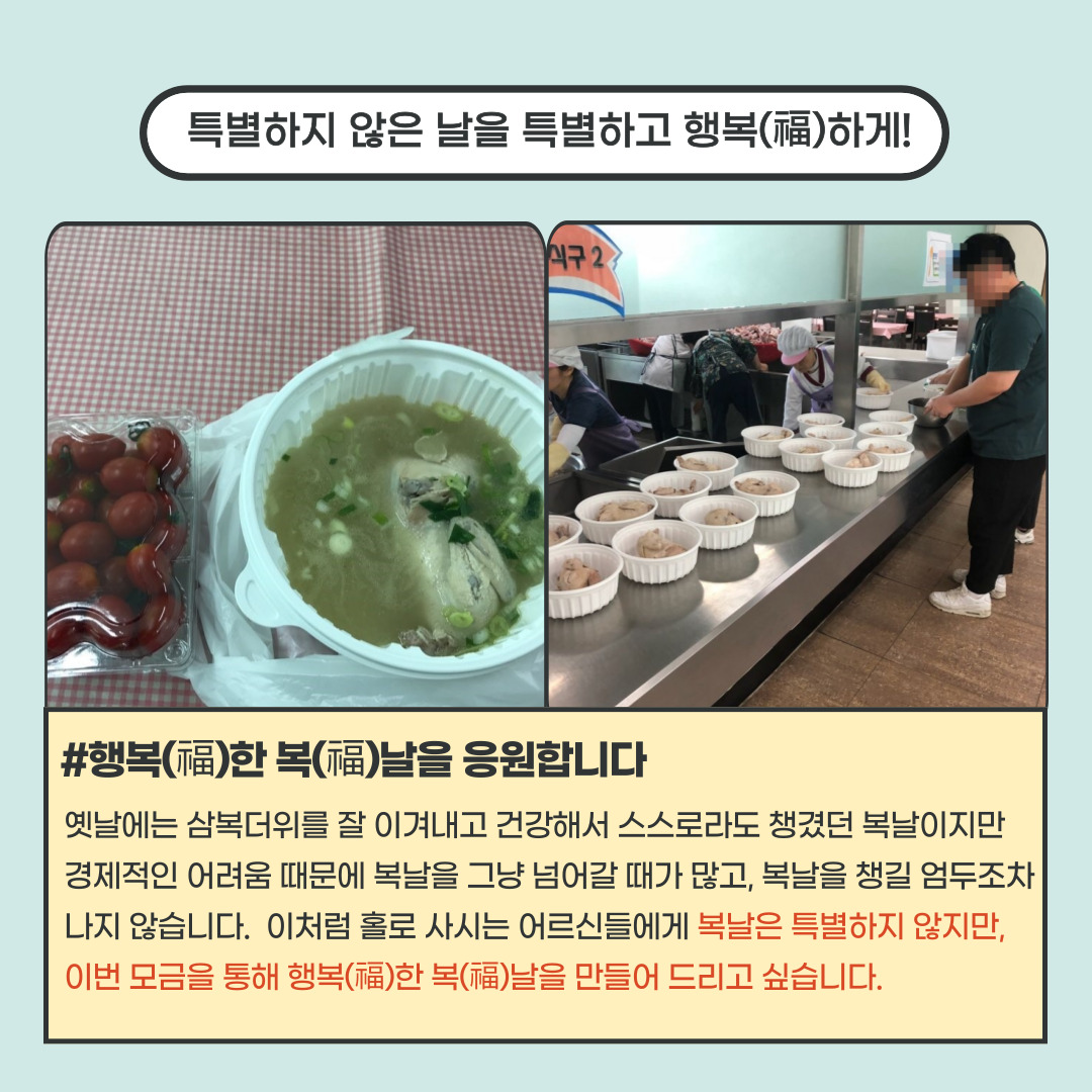 뜨거운 여름은, 평소 질병을 앓고 계시며 영양이 부족한 식생활을 하시는 어르신들에게는 다소 잔인한 계절입니다. 이번 모금을 통해 평소 질병을 앓고 계시며, 영양이 부족한 식생활을 하고 계시는 어르신들의 건강하고 행복(福)한 복(福)날을 응원하고자 합니다.