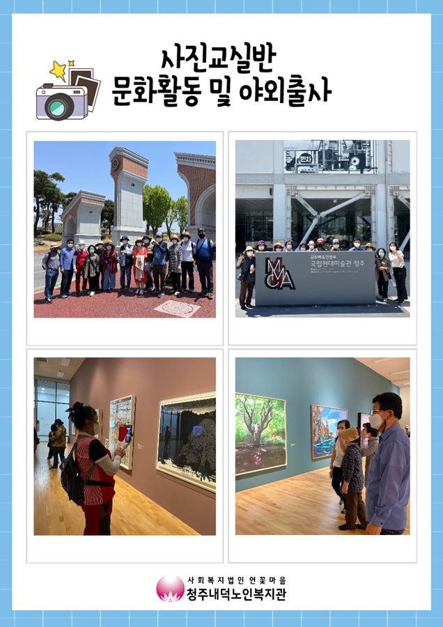 5월 31일 10시에 사진교실반 문화활동 및 야외출사를 진행하였습니다! 청주국립현대미술관에서 전시회를 관람하면서 인상깊은 작품 사진도 찍어보고 청주대로 이동 후 대학교 풍경을 보면서 자유롭게 사진을 찍어보았습니다 날씨가 좀 더웠지만 참여자분들 적극적으로 참여하셔서 잘 진행되었습니다. 오늘 참여자분들이 찍은 사진들은 다음주 수업 진행 시 다같이 확인하여 볼 예정입니다. 앞으로의 교육 진행도 많은 관심부탁드립니다. |