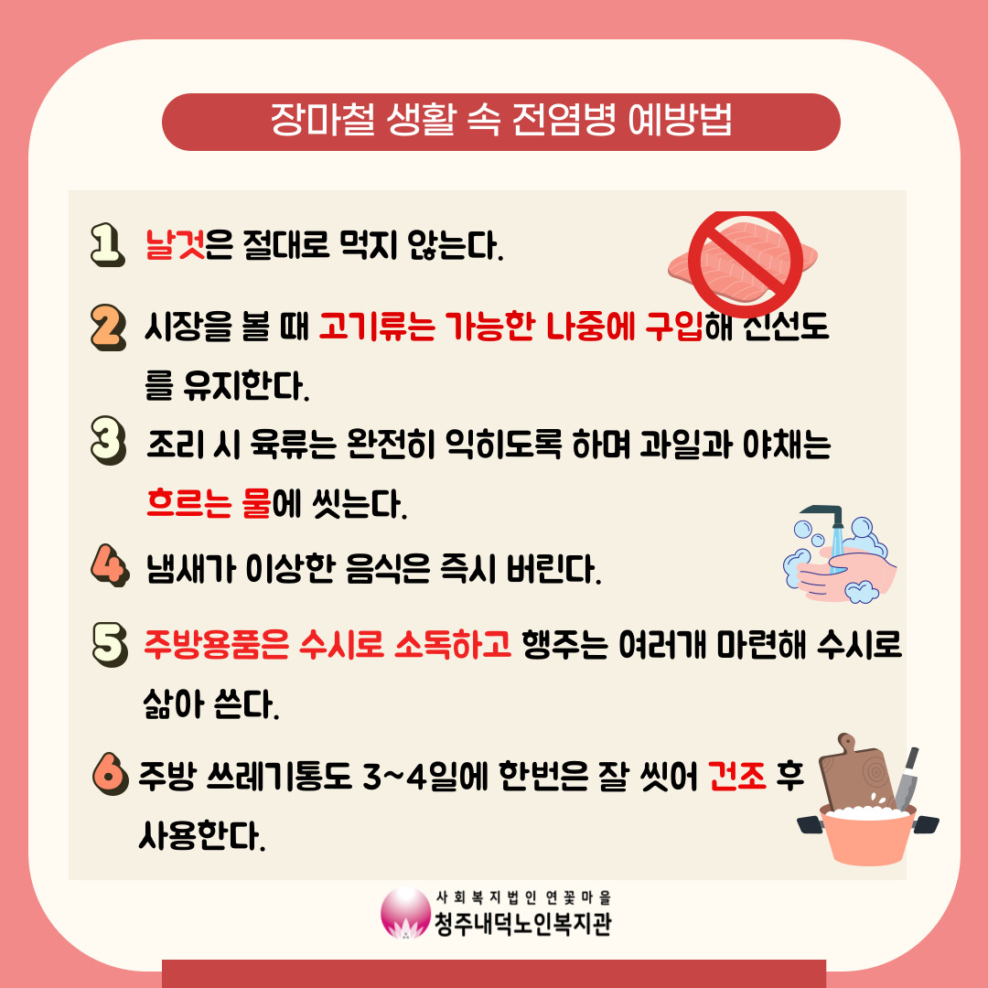 또한 여름철 불청객인 식중독과 각종 전염병에 노출될 수 있으니 노년기에는 더욱 각별한 주의가 필요합니다. 이번 7월 건강소식을 통해 장마철 질환 및 건강관리법과 생활 속 전염병 예방법을 통해 꿉꿉한 장마철을 건강하게 보내세요~!