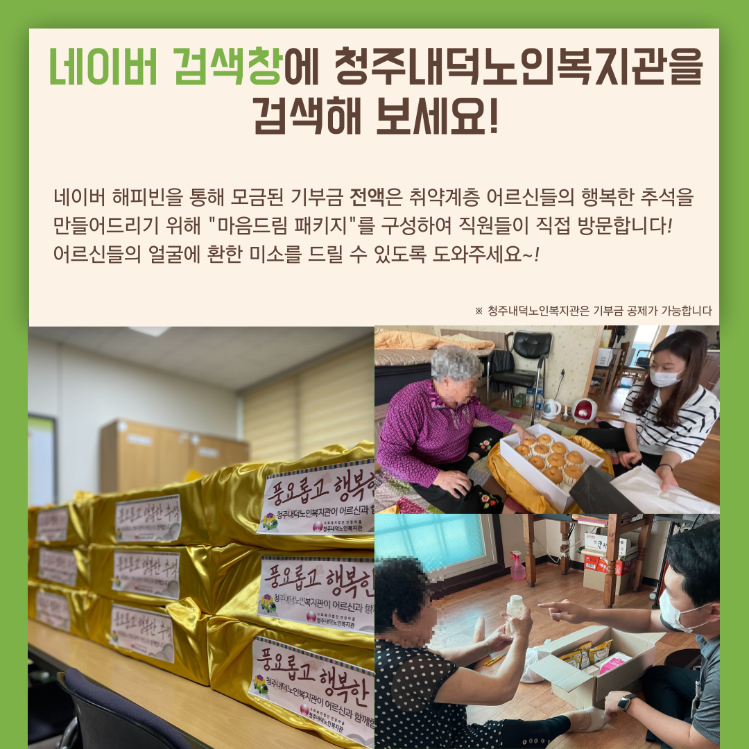 청주내덕노인복지관에서는 추석을 맞이하여 취약계층 어르신에게 "마음드림패키지"를 전달하기 위한 모금활동을 실시합니다! 네이버 해피빈을 통해 모금이 진행되며, 모금된 전액은 취약계층 어르신들에게 "마음드림패키지"를 전달하기 위해 사용됩니다. 네이버에 청주내덕노인복지관을 검색하거나, 아래 링크를 통해 들어가시면 됩니다! 어르신들의 얼굴을 환하게 밝혀주는 보름달이 되어 어르신들의 환한 미소를 볼 수 있도록 도와주세요!