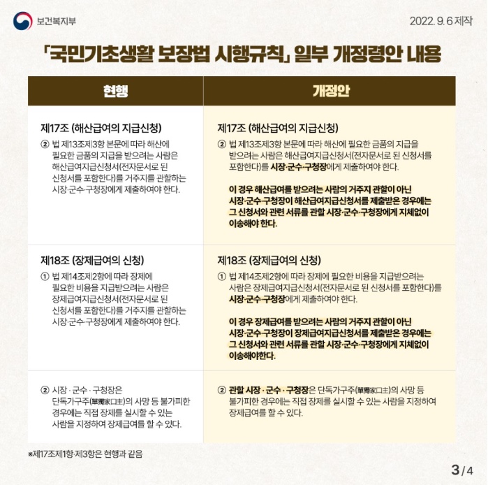 이제 주소지와 관계없이 가까운 읍면동 주민센터(행정복지센터 등)에서 해산 장제 급여 신청이 가능해집니다.