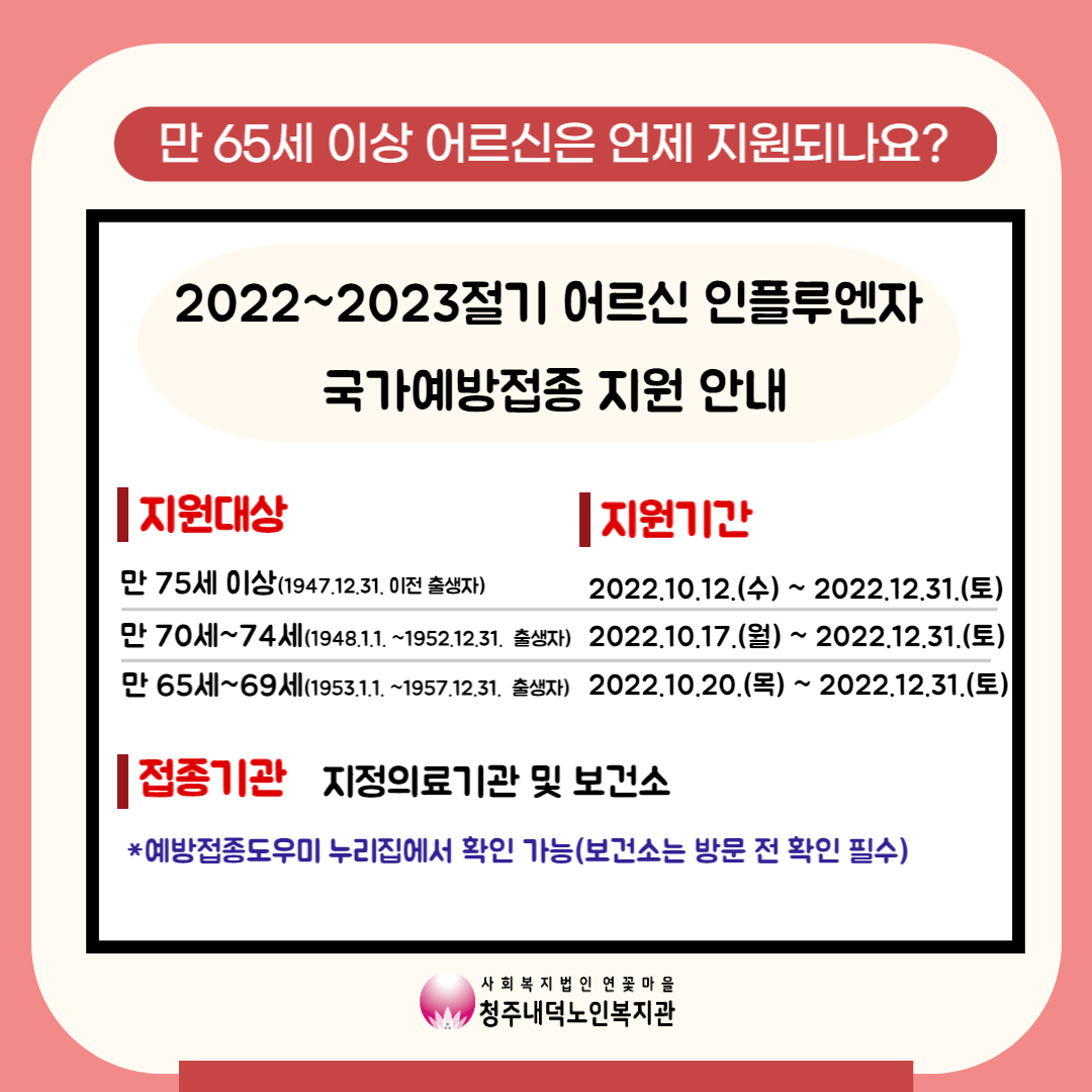 하루 일교차가 많이 나는 환절기입니다. 일반 감기도 걱정이지만 특히 독감이 유행하기 좋은 시기입니다. 면역력이 떨어지기 쉬운 아이, 임산부, 노인 계층을 대상으로 인플루엔자 예방접종을 실시하고 있다고 하니, 11월의 복지관 건강정보를 참고하여 각 접종 시기와 접종 장소를 알고 인플루엔자 유행에 미리 대비해주세요!!