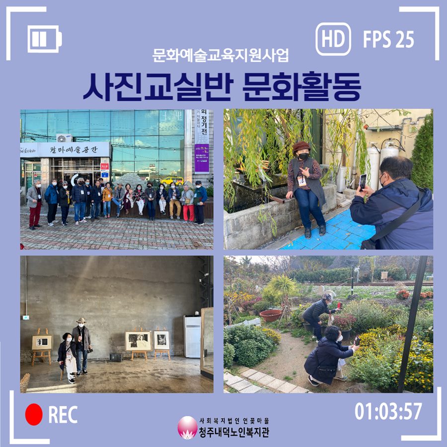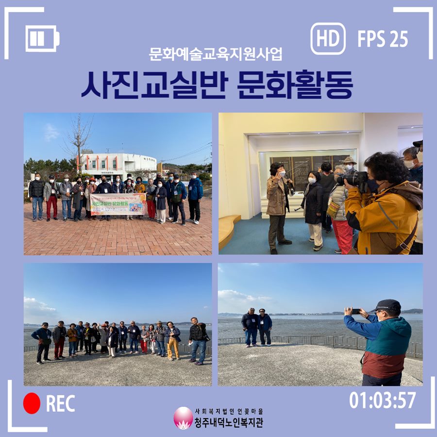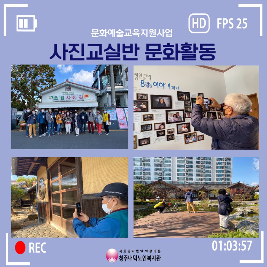 11월 15일 화요일에 문화예술교육지원사업에서 문화활동을 실시하였습니다. 이번에는 전라북도 군산시를 방문하여 문화활동을 진행하였으며, 채만식 문학관, 근대 가옥거리, 예깊 미술관 등을 관람 및 사진 촬영을 하여 문화예술을 더 가까이 해보는 시간을 가졌습니다. 어르신들은 예술 강사님의 안내로 설명을 들으면서 스마트폰으로 직접 사진을 찍어보기도 하시며, 먼 곳으로 와서 다양한 경험을 하고 새로운 풍경을 사진으로 담을 수 있어 좋았다고 소감을 말씀해주신 분도 계셨습니다. 어르신들에게 좋은 경험이 되셨길 바라며 문화예술지원사업 사진교실반은 12월까지 사진에 대한 교육이 진행될 예정입니다.