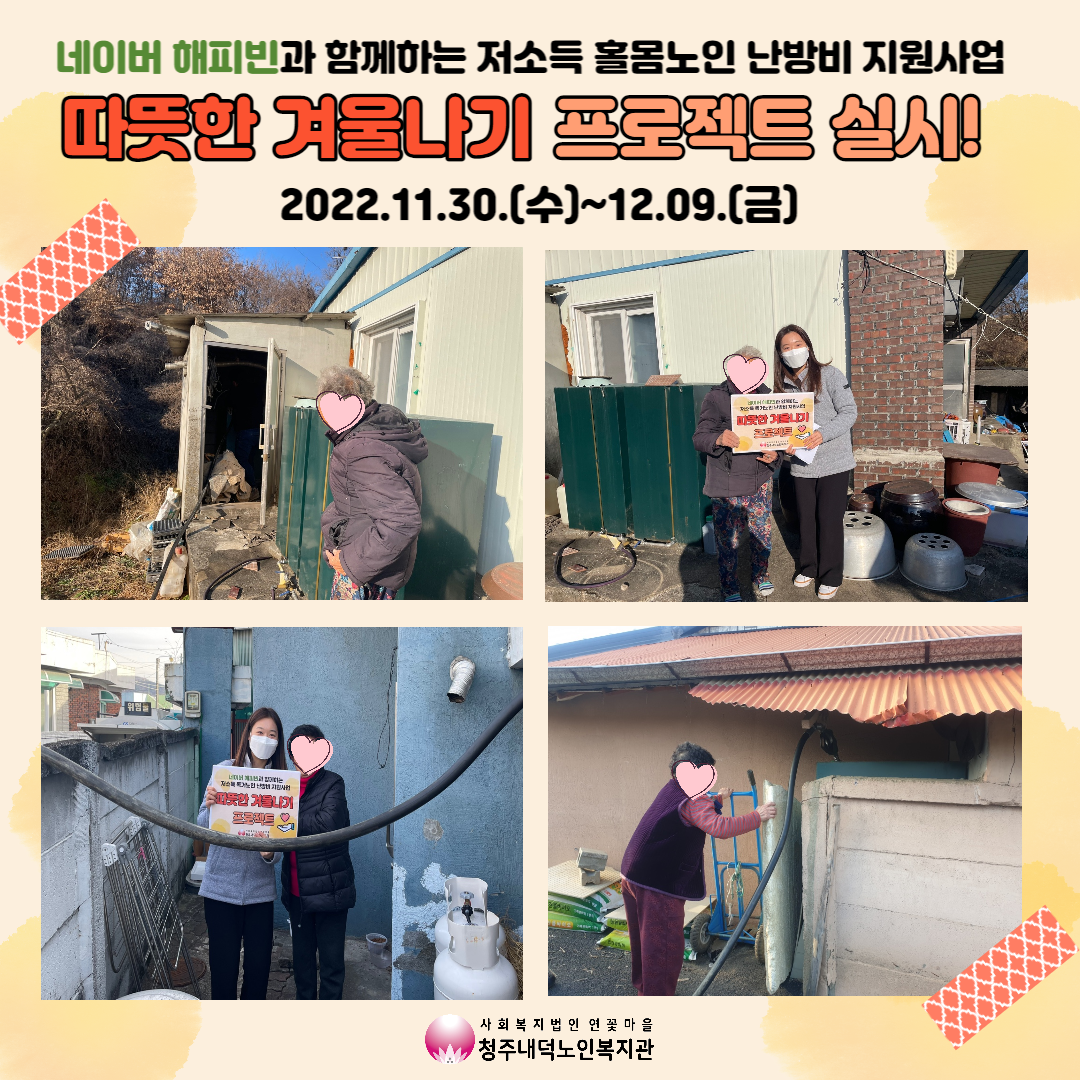 후원자분들에게 감사하다는 말씀을 드리며, 어르신들이 ‘따뜻한 겨울나기 프로젝트’를 통해 추운 겨울을 따뜻하게 잘 보내셨으면 좋겠습니다!! 앞으로도 재가 어르신들의 건강한 생활을 위해 노력하는 청주내덕노인복지관이 되겠습니다~!