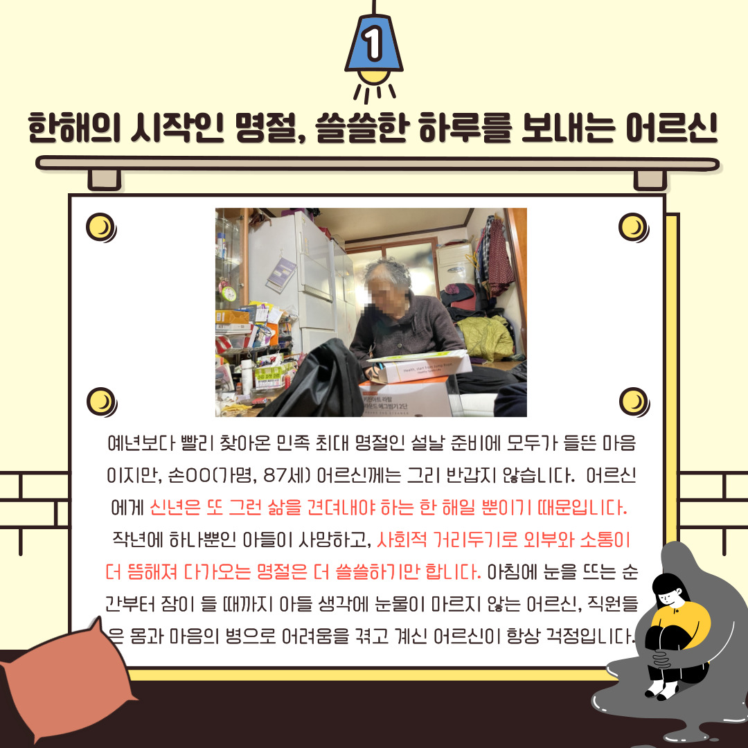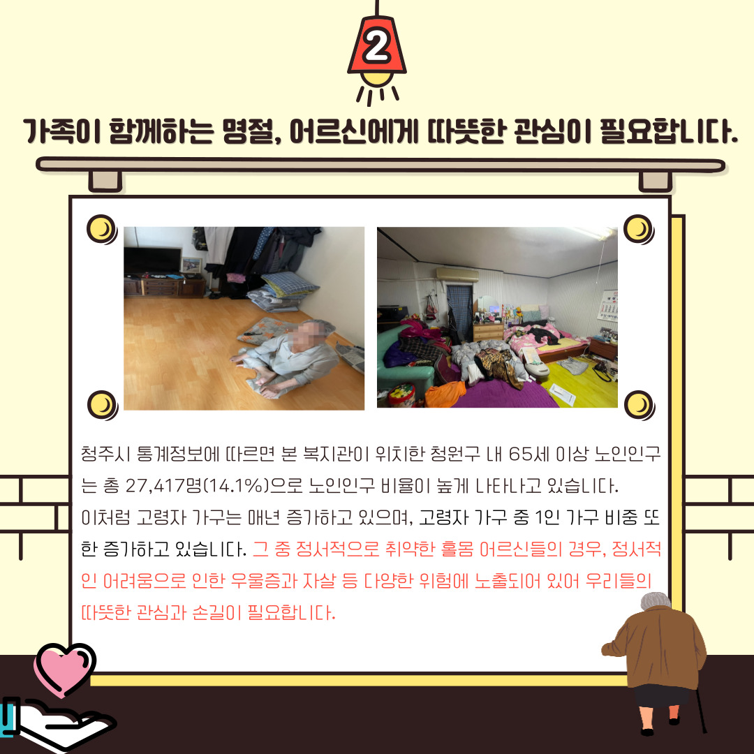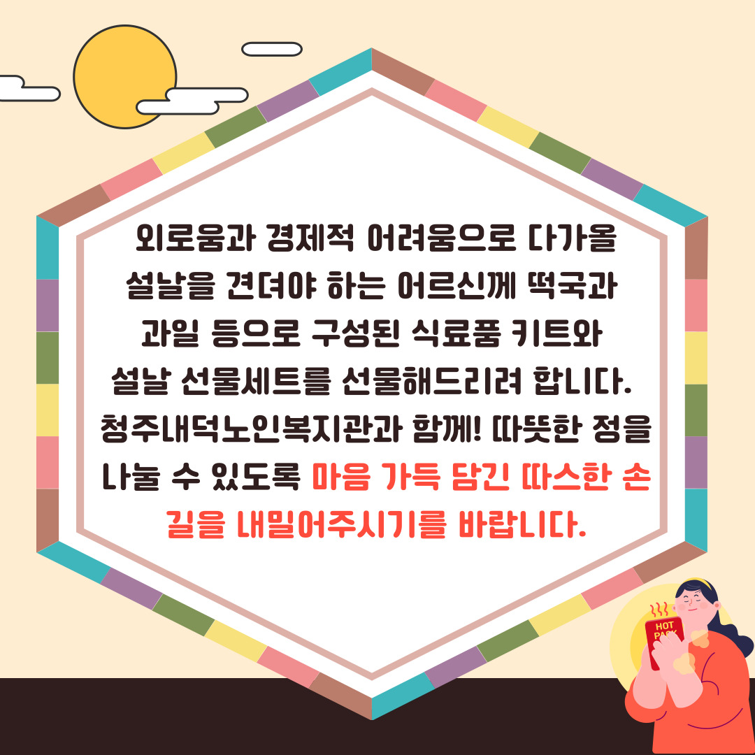 저희 복지관에서는 재가어르신들의 설날마음드림패키지 지원을 위한 네이버 해피빈 모금사업을 진행 중입니다! 외로움과 경제적 어려움으로 다가올 설날을 견뎌야 하는 어르신께 떡국과 과일 등으로 구성된 식료품 키트와 설날 선물 세트를 선물해드리려 합니다. 청주내덕노인복지관과 함께! 따뜻한 정을 나눌 수 있도록 마음 가득 담긴 따스한 손길을 내밀어주시기를 바랍니다.