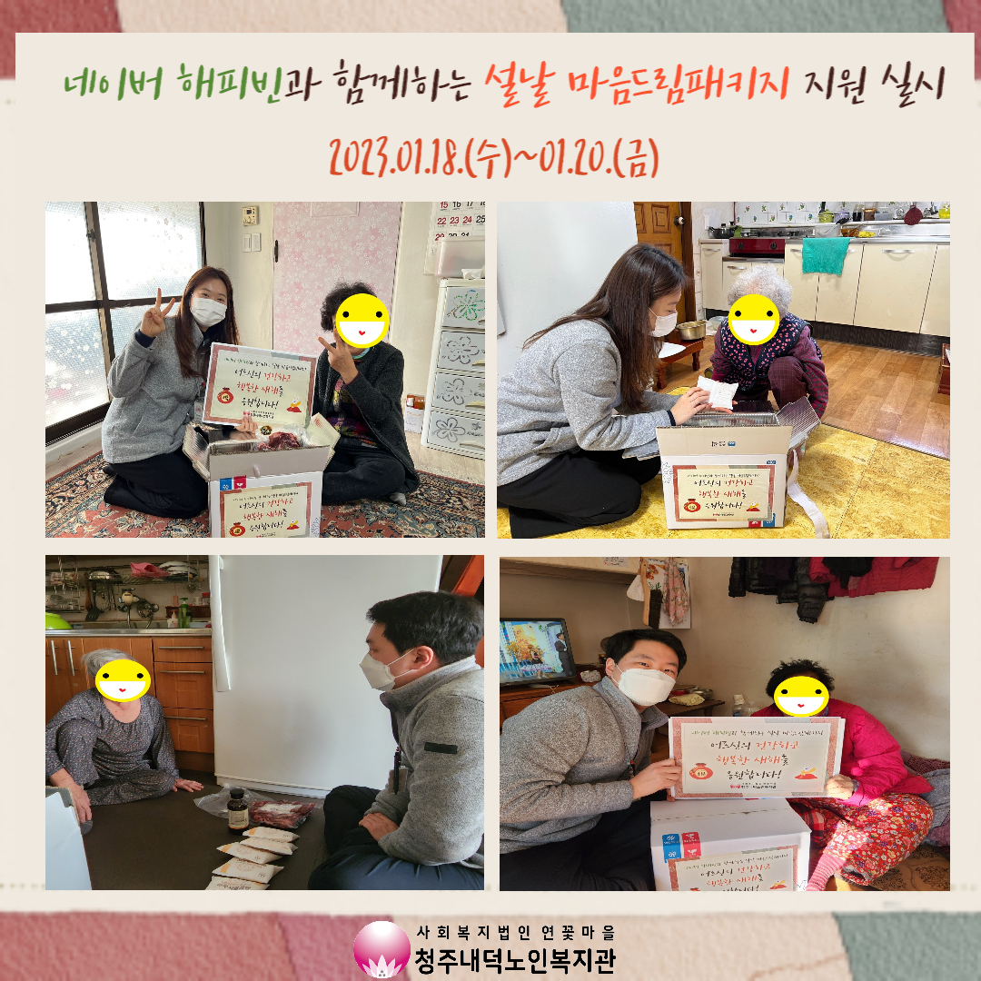 청주내덕노인복지관에서는 1월 18일(수)~1월 20일(금) 3일간 네이버 해피빈 모금 결과에 따라 ‘설날 마음드림패키지’지원을 실시하였습니다.
