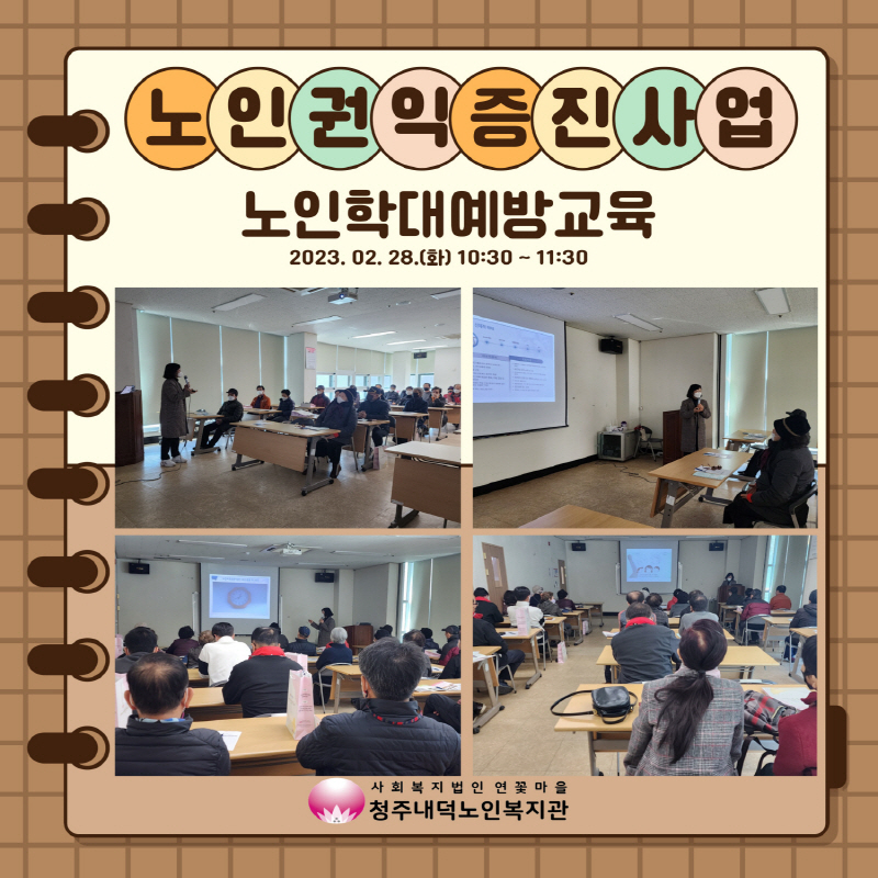 청주내덕노인복지관에서는 2월29일(화) 10시30분~11시30분까지 노인권익증진을 위한 노인학대예방교육을 실시하였습니다. 이번 노인학대예방교육은 충북노인보호전문기관 지원을 통하여 복지관 이용자를 대상으로 교육이 진행되었습니다. 노인학대유형 및 신고의무자 등 다양한 영상과 사례를 통해 알아볼 수 있었습니다. 참여 이용자 중 한 분께서는 사례중심을 통해 설명을 해주셔서 보다 이해가 쉽게 되었고, 교육이 지루하게 느껴지지 않았다고 하셨으며, 궁금한 점에 대해 해소할 수 있는 좋은 기회였다고 말씀을 전해주셨습니다. 끝까지 교육에 참여해주신 참여자분들에게 감사의 말씀을 드리며, 앞으로도 저희 청주내덕노인복지관을 이용해주시는 어르신들의 권익증진을 위하여 다양한 교육을 제공하고자 하오니 앞으로도 많은 관심과 참여를 바랍니다.
