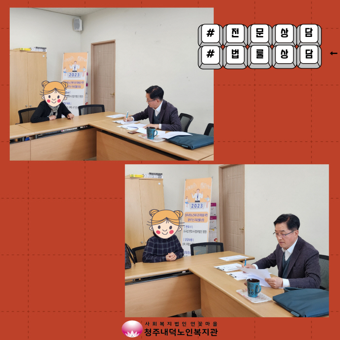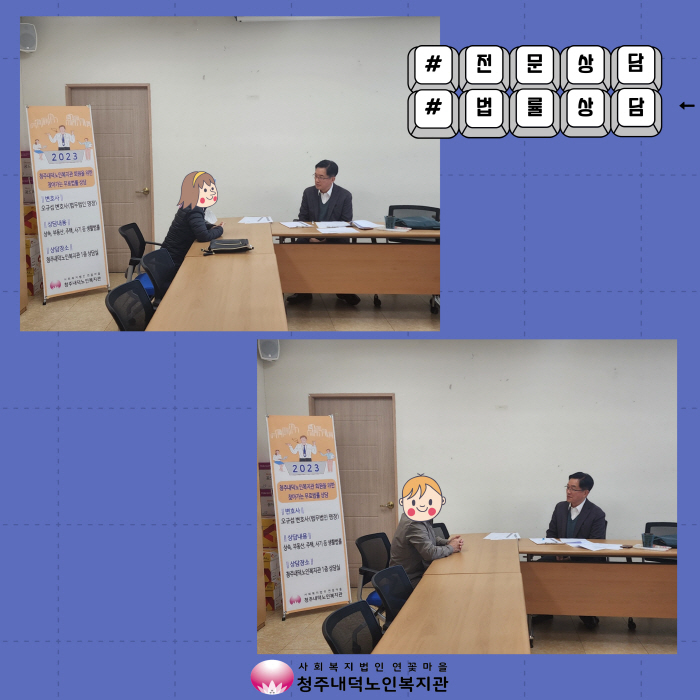 3월14일(화) 13시30분부터 15시30분까지 2023년 상반기 무료법률상담이 진행되었습니다. 무료법률상담은 법무법인 명장 오규섭 변호사의 지원으로 어르신들이 부동산 및 상속 등과 관련된 전문상담 기회를 마련하였고 법률적으로 도움이 필요한 5명의 회원님이 상담을 받으셨습니다. 상담을 받은 회원님들은 변호사와의 상담으로 문제 해결에 도움이 되었고, 속이 시원해진 것 같다고 말씀해주시며 상담 기회를 제공해 준 것에 대해 감사를 표현하였습니다. 2023년 하반기에도 일상생활 속 법적 문제로 어려움을 겪고 있는 회원을 위한 무료법률상담 기회를 제공하고자 하오니 많은 관심과 참여 바랍니다.