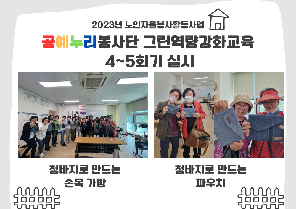 청주내덕노인복지관에서 진행하는 2023년 노인자율봉사활동사업 공예누리봉사단 그린역량강화교육이 5월 2일(화), 5월 16일(화) 4~5회기가 진행되었습니다. 공예누리봉사단은 버려지는 소재를 활용한 '업사이클링'을 통해 다시 사용 가능한 작품을 만들어 내는 활동을 하고 있습니다. 이번 4회기, 5회기 활동에서는 '청바지로 만드는 손목가방' 및 '청바지로 만드는 파우치'를 진행하였습니다.