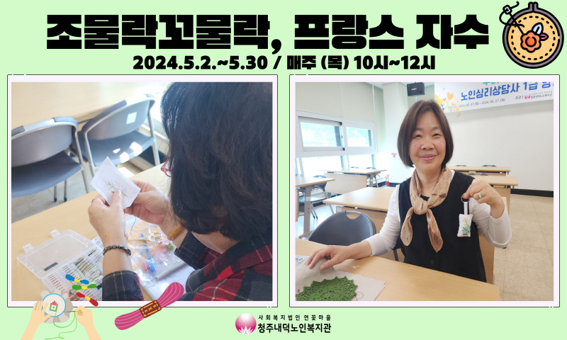 조물락꼬물락, 프랑스자수 프로그램에 많은 관심과 응원부탁드립니다. 청주내덕노인복지관 문화복지과 문유진사회복지사 (문의전화) ☎ 216-9810
