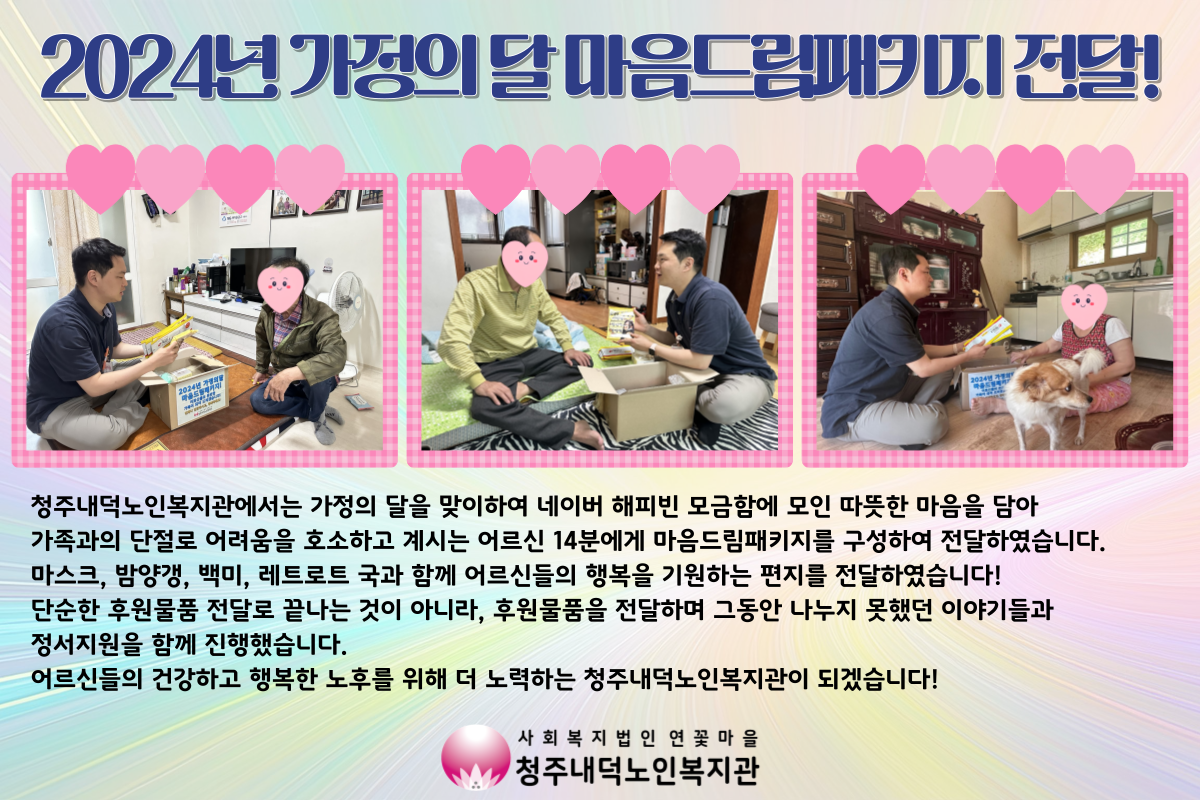 5월 31일 금요일, 청주내덕노인복지관은 가족과 단절된 어르신들을 찾아뵙고, 경제적, 정서적으로 도움을 드릴 수 있는 마음드림패키지를 청원구에 거주하시는 열 네분의 어르신에게 전달해 드렸습니다. 이번 가정의달 마음드림패키지에는 병원에 자주 다니셔야 하는 어르신들을 위해 마스크와 청결을 위한 비누, 어르신들의 간식이 되어줄 밤양갱과, 통에 담겨있어 보관에 용이한 백미, 그리고 부족한 식탁에 든든한 힘이 되어 줄 레트로트 국 10종으로 구성되어 어르신들의 욕구에 맞는 맞춤형으로 구성하였습니다.