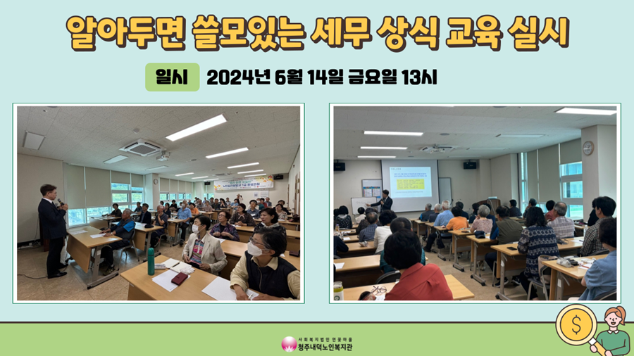 청주시평생학습관의 지원으로 찾아가는 청주시민학교 교육의 일환으로 6월 14일(금) 13시 복지관 2층 배움방에서 알아두면 쓸모있는 세무상식 교육이 진행되었습니다. 이번 교육은 재산의 이전(양도, 증여, 상속)과 관련된 세금과 재산의 운용(부동산 임대, 금전의 운용)에 따른 세금에 대해 알아보았습니다. 세무 상식에 관심 있으신 많은 분들이 강의실을 가득히 채워 앉아주셨으며, 강사님의 말씀을 경청하면서 자료를 열심히 사진 촬영하고 필기하셨으며, 수업 중간중간에도 질문을 열심히주셨습니다. 교육을 들은 참여자분들은 어려운 세무상식을 이해하기 쉽게 강의해주셔서 많은 도움이 되었다, 매우 유익했다 등 많은 정보를 알아가실 수 있었다고 좋아하셨습니다! 찾아가는 청주시민학교는 앞으로도 3개의 프로그램이 더 진행될 예정입니다. 많은 관심과 참여부탁드리며, 복지관 이용자분들이 다양한 정보를 제공받으실 수 있는 기회를 마련 할 수있도록 노력하겠습니다!