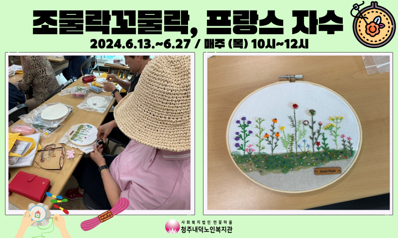 청주내덕노인복지관에서는 매주 목요일 10시부터 12시까지 평생학습우수프로그램지원사업인 조물락꼬물락, 프랑스자수 프로그램이 있는 날입니다.