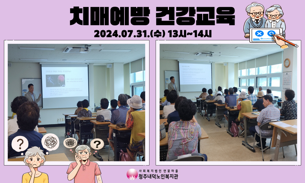2024년 7월31일(수) 오후1시부터 2시까지 청주내덕노인복지관 2층 으뜸방에서 청주대학교 스포츠재활학과 홍영기교수님과 함께 치매예방 건강교육이 진행되었습니다.