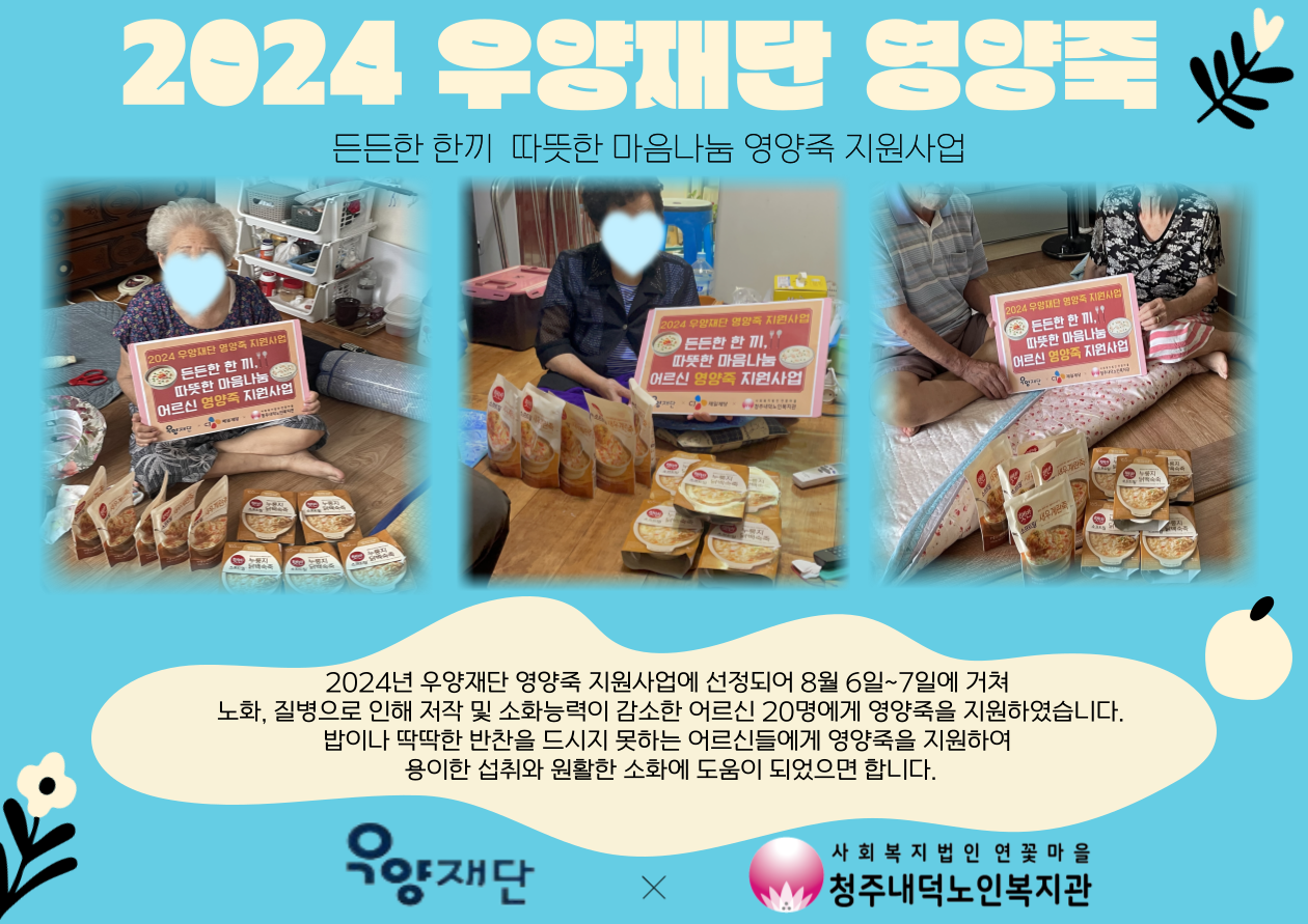 안녕하세요 ~~! 청주내덕노인복지관 입니다 ~~!^^ 2024년 우양재단 영양죽 지원사업에 선정되어 어르신들에게 영양죽을 지원할 수 있게 되었습니다.