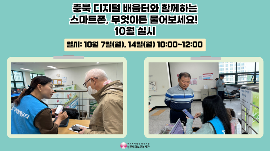 충북디지털배움터와 연계해서 진행하는 스마트폰 무엇이든 물어보세요(에듀버스)가 8,9월에 이어 10월에 마지막 상담을 진행하였습니다. 9,10월에는 1층 로비가 공사 중인 관계로 2층 복도에서 진행하였는데요, 프로그램 및 동아리 이용을 위해 계단으로 오가가시던 이용자분들이 궁금증을 갖고 오셨다가 평소 스마트폰 사용법에 대한 궁금증까지 해소하고 가실 수 있었습니다 충북디지털 배움터 강사님들이 스마트폰 용량 관리부터 병원에 필수가 된 신분증을 편하게 보여줄 수 있도록 모바일 건강보험증 발급 방법까지 다양한 사용법에 대해 알려주셨습니다. 이용자분들의 스마트폰 사용법에 대해 알려주시고 3D펜 체험까지 제공해주신 충북디지털배움터에 감사드리며, 앞으로도 이용자분들의 스마트 기기 사용 지식 습득을 위하여 다양한 프로그램들을 제공할수 있도록 노력하겠습니다!