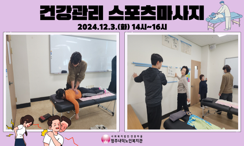 2024년 12월 3일(화) 오후2시30분부터 3시30분까지 청주내덕노인복지관 2층 으뜸방에서 청주대학교 스포츠재활학과 김정현교수님 그리고 스포츠재활학과 학생들과 함께 건강관리 스포츠마사지가 진행되었습니다.