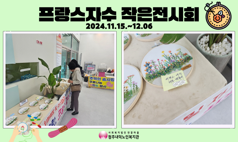 청주내덕노인복지관에서 진행되는 평생학습우수프로그램 프랑스자수 조물락꼬물락이 11월15일부터 12월 6일까지 작품전시가 진행되었습니다.