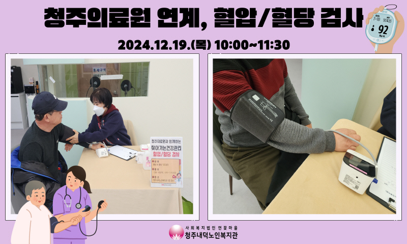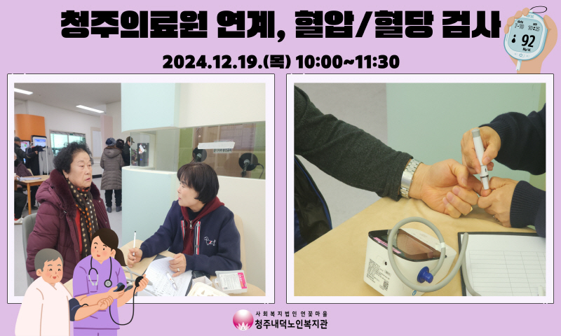 청주내덕노인복지관에서는 12월19일(목) 청주내덕노인복지관 1층 로비에서 충청북도청주의료원 공공보건의료협력팀과 연계하여 혈압 및 혈당 관리가 진행되었습니다.