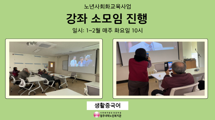 이번 겨울방학기간에는 생활중국어와 생활댄스 중급 강좌가 소모임을 진행하게 되었습니다. 두 강좌는 방학기간동안 강사님 없이 수강생분들끼리 자율적으로 중국어 공부, 댄스 동작 연습을 진행 할 예정입니다. 생활중국어 강좌에는 중국 드라마 등을 시청하시면서 중국어의 회화표현해 대해 공부하시면서 번역 어플도 활용하셨고, 생활댄스 중급도 노래에 맞춰서 장르별 동작을 연습하시는 등 두 강좌 모두 첫날부터 적극적으로 모임을 진행하였습니다. 방학기간에도 열심히 자기계발에 임하시는 수강생분들을 응원드리며, 앞으로도 이용자분들이 다양한 자기계발을 할 수 있는 기회를 마련하는 데 노력하겠습니다!