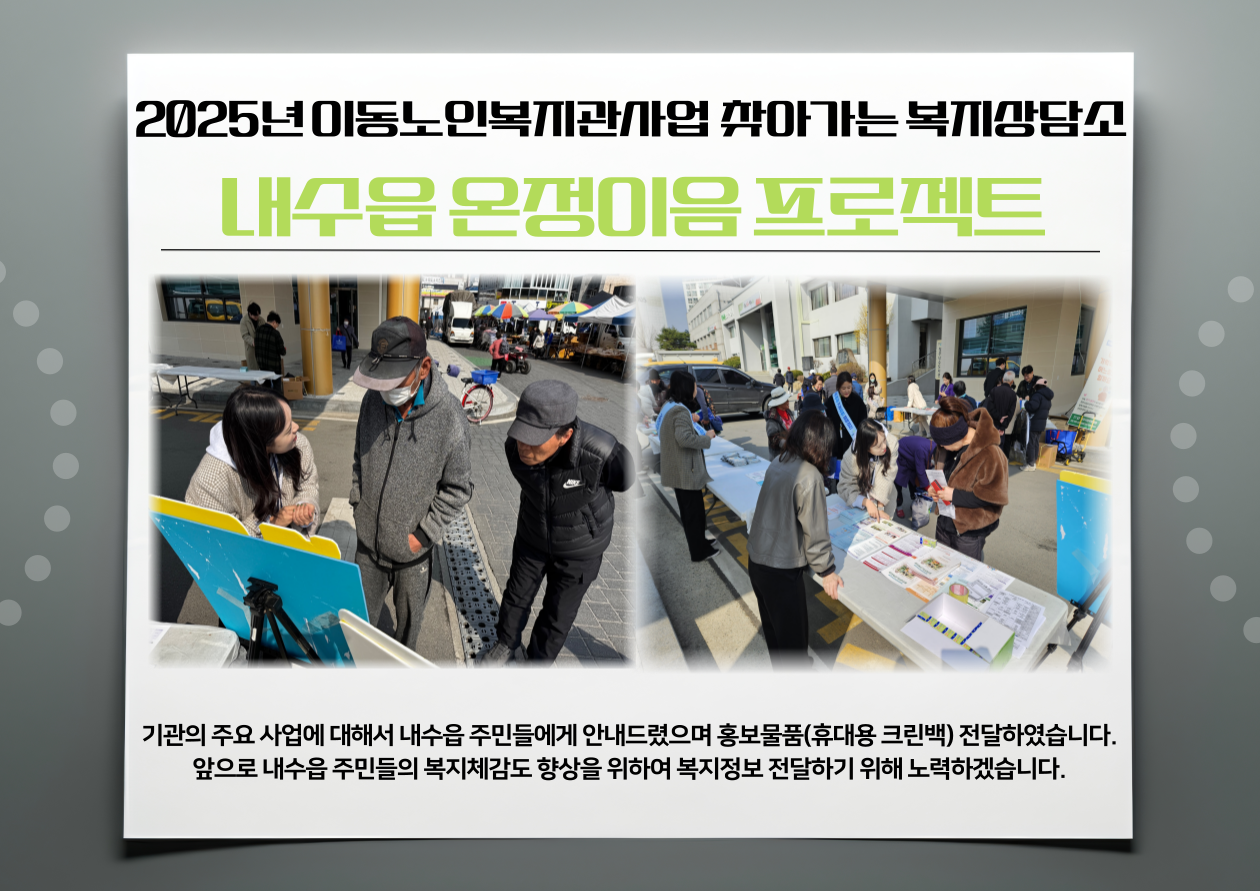 | 2025년 이동노인복지관사업 찾아가는 복지상담소 내수읍 온정이음 프로젝트 | |||