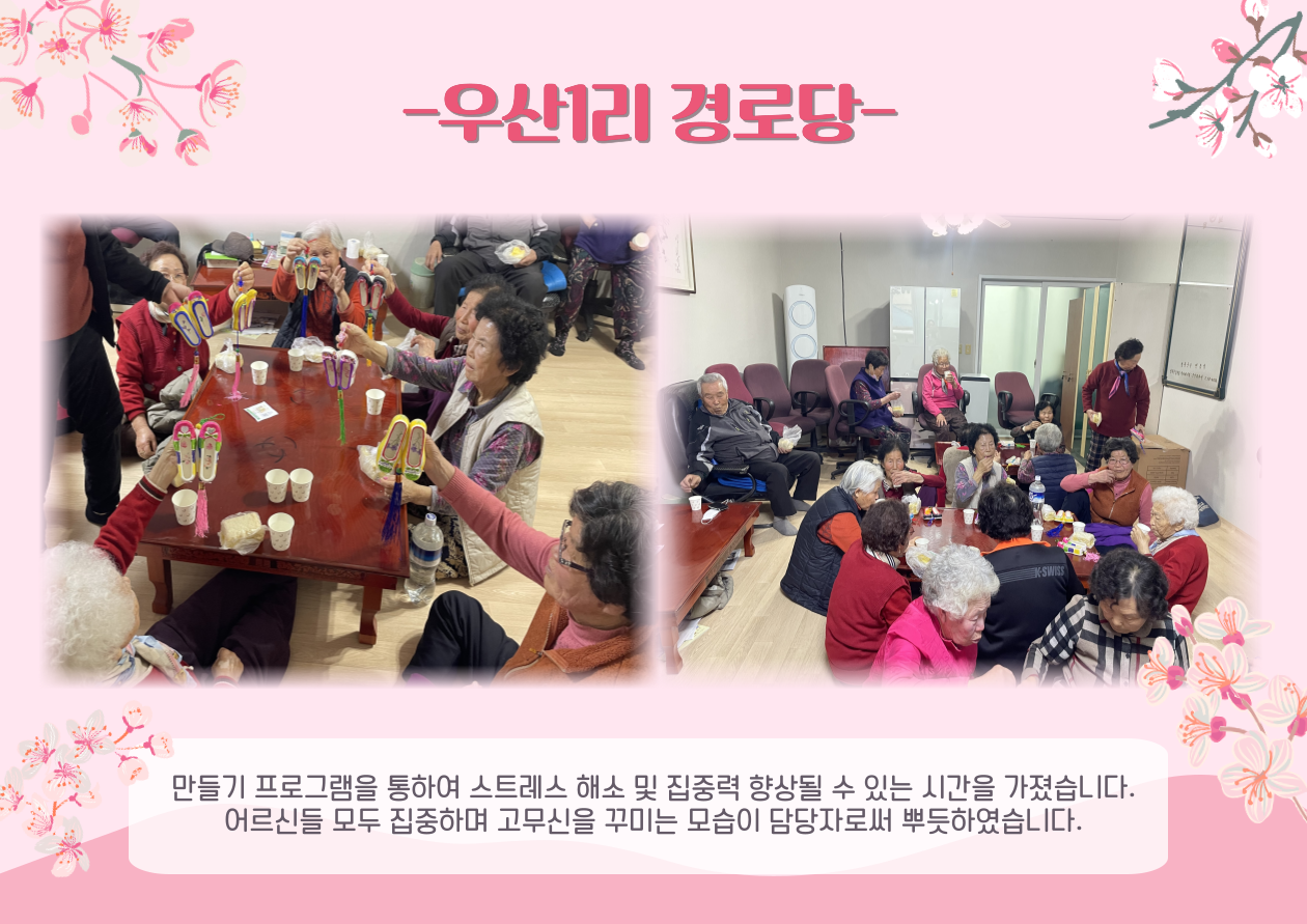 찾아가는 이동노인복지관사업 2025년 처음 실시하는 경로당 프로그램 이였습니다. 앞으로도 더 흥미로운 프로그램을 어르신들이 경험하실 수 있도록 노력하겠습니다~!
