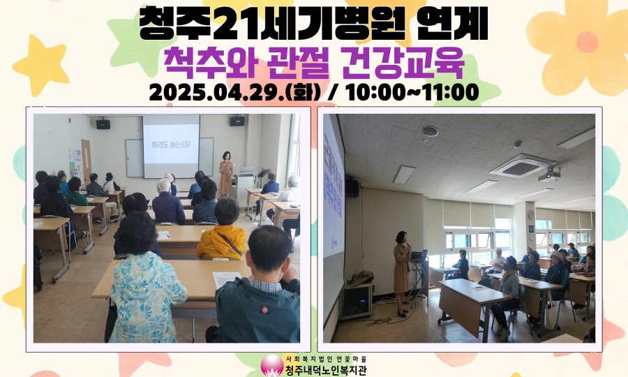 2025년 4월 29일(화) 10시~11시 청주내덕노인복지관 2층 배움방에서 청주21세기병원과 함께하는 척주와 관절 건강교육을 진행하였습니다.