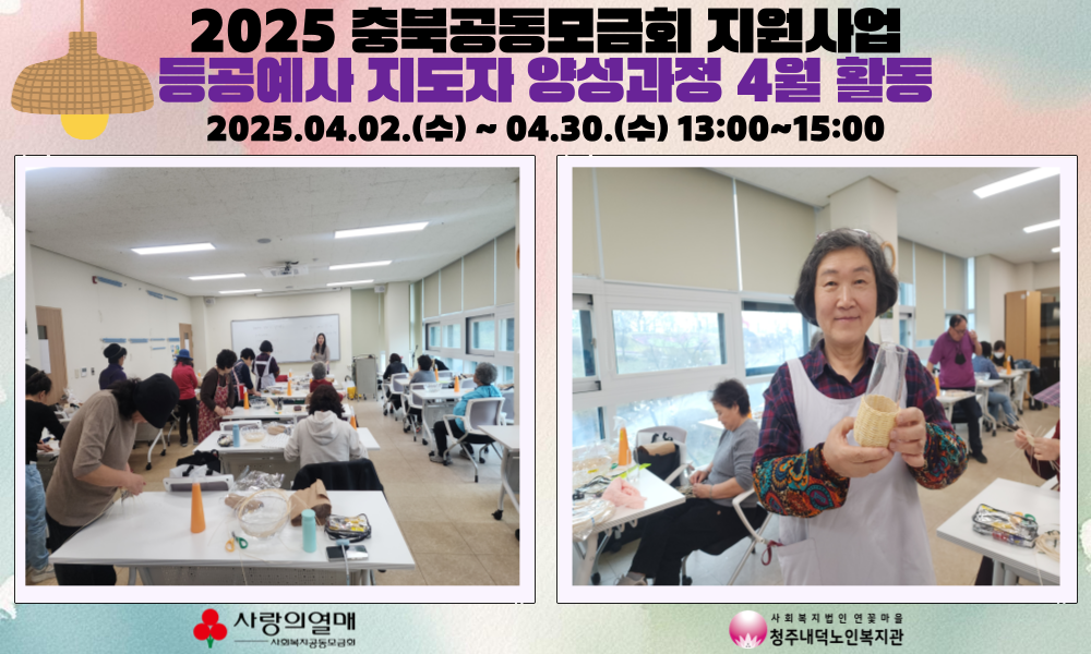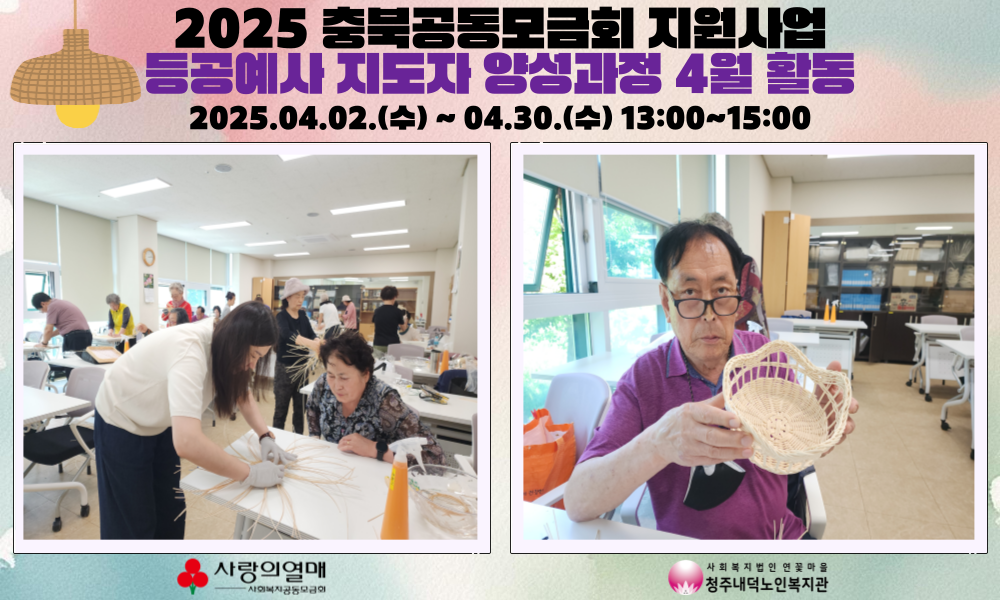 2025년 4월 2일부터 30일까지, 매주 수요일 오후 1시~3시까지 청주내덕노인복지관 2층 으뜸방에서 공동모금회지원사업인 탄탄대로! 라탄 등공예사 지도자 양성과정 교육이 진행되었습니다.