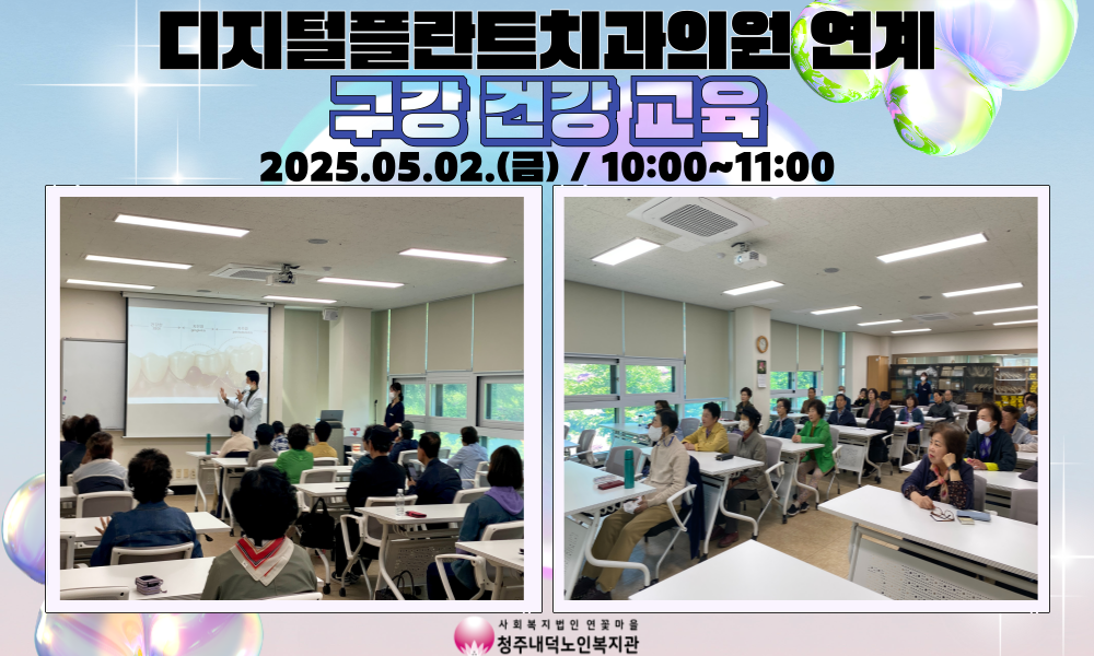 2025년 5월 2일(금) 10시~11시 청주내덕노인복지관 2층 으뜸방에서 디지털플란트치과의원과 함께 구강 건강교육을 진행하였습니다.