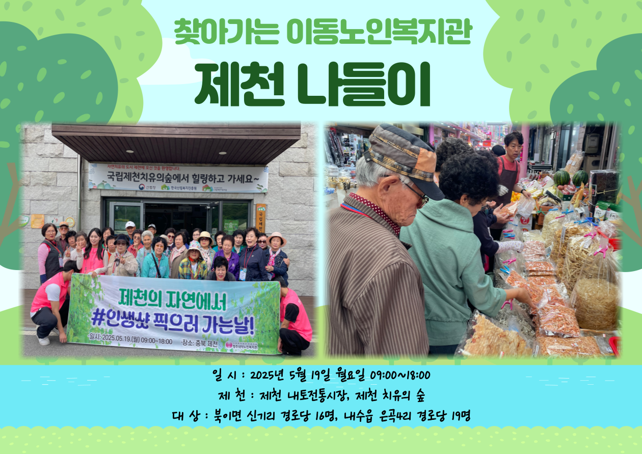 2025년 찾아가는 이동노인복지관 사업의 일환으로 5월 19일 월요일 북이면 신기리 경로당 16명과 내수읍 은곡4리 경로당 19명 총 35명의 어르신들과 함께 제천으로 나들이를 다녀왔습니다.