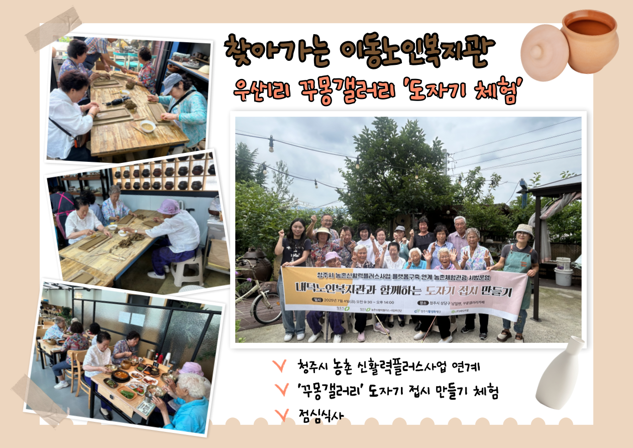 지난 6월에 진행되었던 도자기 접시 만들기 체험의 참여자 만족도가 높아 다른 경로당 이용주민 대상으로 한번 더 다녀왔습니다! 이번 농촌체험관광은 내수읍 우산1리 경로당 이용주민 14분과 함께 하였습니다.