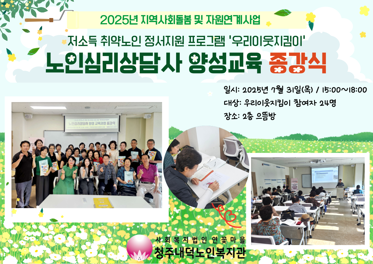 청주내덕노인복지관에서는 7월 31일(목) 총 8회기의 노인심리상담사 양성 교육과정을 수료한 '우리이웃지킴이' 참여자 24명과 함께 종강식을 진행하였습니다. 노인심리상담사 교육과정을 이수한 참여자들은 8월부터 저소득 취약노인을 대상으로 정서지원 프로그램을 통해 지금까지 배운 내용을 실습해보는 활동을 갖게 될 예정입니다. 참여자들은 "누구에게나 찾아오는 노년에 대비하여 노인들의 심리를 이해할 수 있어서 유익했다.", "내 부모님과 배우자, 가족들을 이해하는 데 한층 도움이 되었다.", "열심히 공부해서 자격증을 취득한 내 자신에게 뿌듯한 마음이 들었다." 등, 다양한 소감을 전해주셨습니다. 앞으로 지역사회에서 우리이웃지킴이들이 펼쳐나갈 실천 활동에 대해서도 많은 관심과 응원 부탁드립니다~!