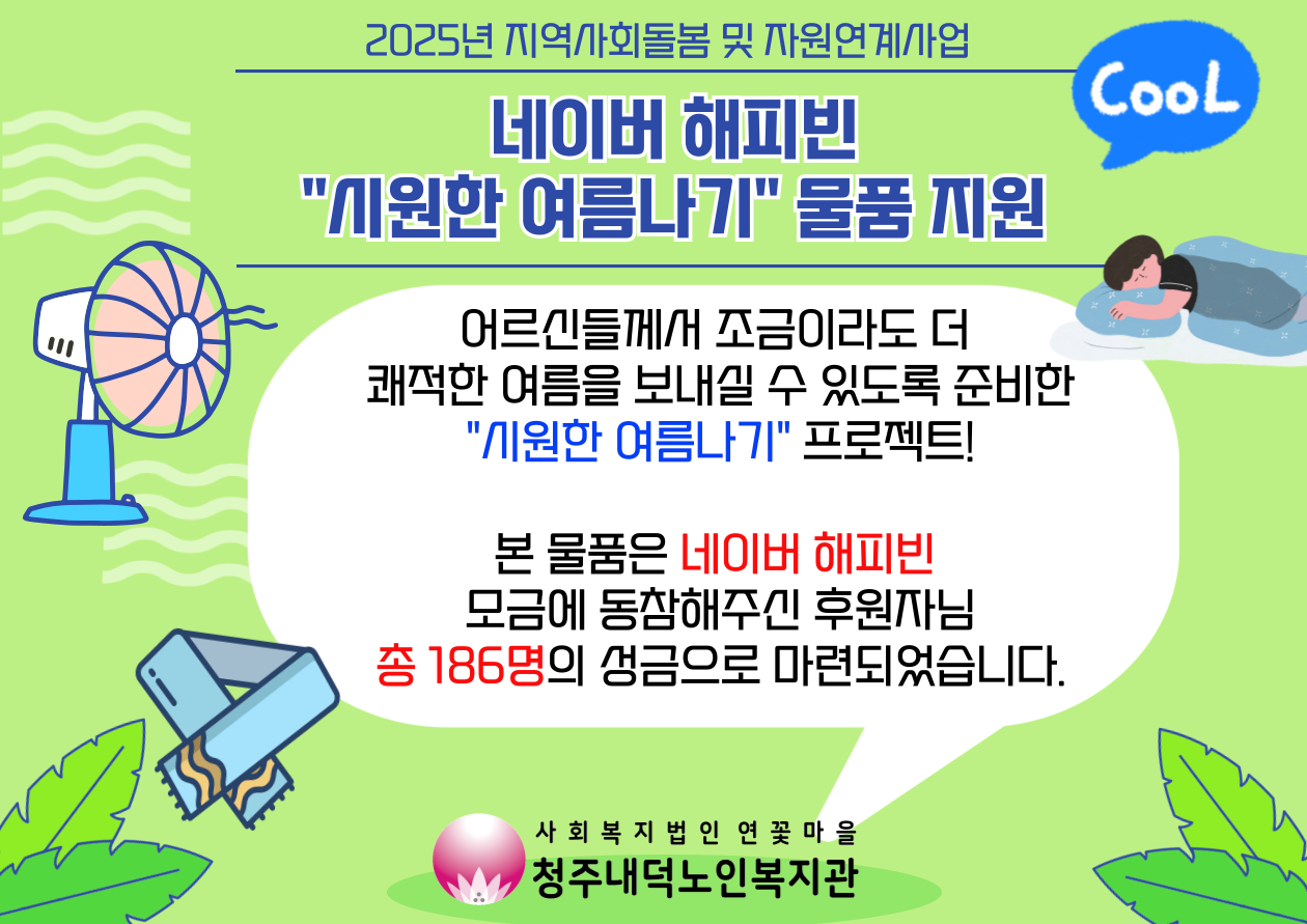 청주내덕노인복지관에서는 지난 7월 28일(월)부터 7월 31일(목)까지 폭염에 취약한 주거환경에 놓여 있는 재가 어르신 15명을 대상으로 "시원한 여름나기 프로젝트"를 진행하였습니다. 이번에 진행된 ‘시원한 여름나기’ 프로젝트는 186명의 네이버 해피빈 후원자분들의 마음이 담긴 모금액 2,045,600원으로 무더운 여름을 보내는 데 유용한 물품 4종(선풍기, 여름이불, 쿨링타월, 삼계탕)을 구입하여 전달해드릴 수 있었습니다. 오래된 선풍기의 발열로 머리에 수건을 덮어두고 사용하시던 어르신, 전선이 낡아 고무테이프로 감아놓은 채 사용하시던 어르신, 선풍기가 분리되지 않도록 박스테이프로 고정해두신 어르신 모두에게 튼튼한 새 선풍기를 선물해드렸습니다. “선풍기 소리가 요란해서 언제 망가질까 불안했는데, 이제 한걱정 덜었어.” “꿉꿉한 헌이불 대신 깨끗한 새이불을 덮으니 잠도 솔솔 잘 올 것 같아.” 어르신들께서 만족해하시는 모습에 저희도 큰 보람을 느낄 수 있었습니다.