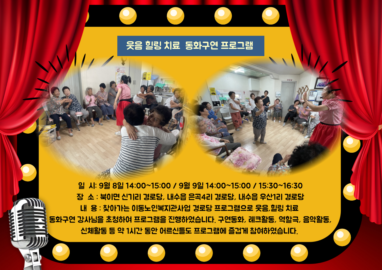 9월 8일 14:00~15:00 북이면 신기리 경로당, 9월 9일 14:00~15:00 내수읍 은곡4리 경로당, 9월 9일 15:30~16:30 내수읍 우산1리 경로당에서 찾아가는 이동노인복지관 사업 경로당 프로그램으로 웃음치료 동화구연 강사님을 초청하여 프로그램 진행하였습니다.