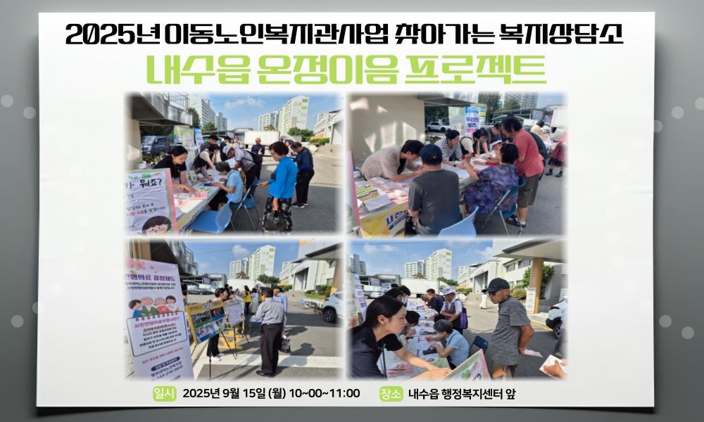 2025년 찾아가는 이동노인복지관사업 찾아가는 복지상담소로 내수읍 행정복지센터 앞에서 온정이음 프로젝트 실시하였습니다. 7,8월에는 혹서기로 인하여 미진행되어 2달 만에 진행되었으며, 청주복지재단, 청주시장애인복지관, 청원보건소 치매센터팀, 금연지원센터, 청원정신건강복지센터와 함께하였습니다.