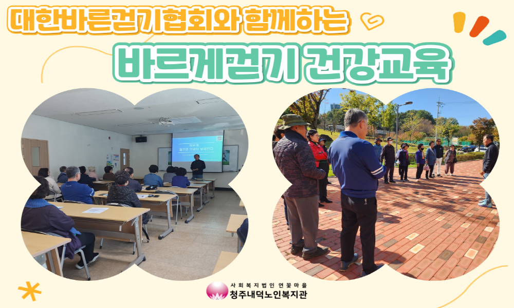 청주내덕노인복지관은 2025년 10월27일(월) 10시부터 12시까지 대한바른걷기협회와 함께 바르게걷기 건강교육이 진행되었습니다 걷기의 중요성과 바른자세에 대해 이론교육이 진행되었습니다. 이후 새적굴공원으로 이동하여 올바른 자세를 익히며 노르딕워킹에 대해서도 알아볼 수 있었습니다 많이 추워진 날씨, 다치지 않고 바르게 걸으며 건강챙기시길 바라겠습니다 |