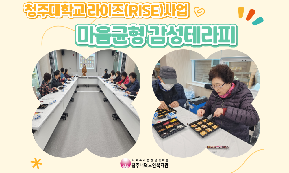 청주내덕노인복지관에서는 2025년 11월 26일(수) 청주대학교 라이즈(RISE)사업인 마음균형 감성테라피를 지하 1층 강의실에서 진행하였습니다. 마음 치유를 위한 감정 교육과 함께 과자를 활용한 푸드테라피를 진행하였습니다. 참여자들 또한 프로그램에 참여하면서 자신의 감정을 다시 돌아보며 편안한 마음을 가질 수 있었다고하였습니다. 내년에도 이용자들의 마음을 치유할 수 있는 프로그램으로 찾아뵙겠습니다.