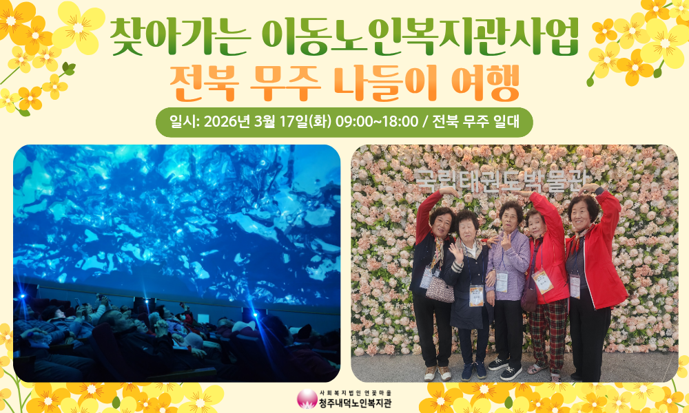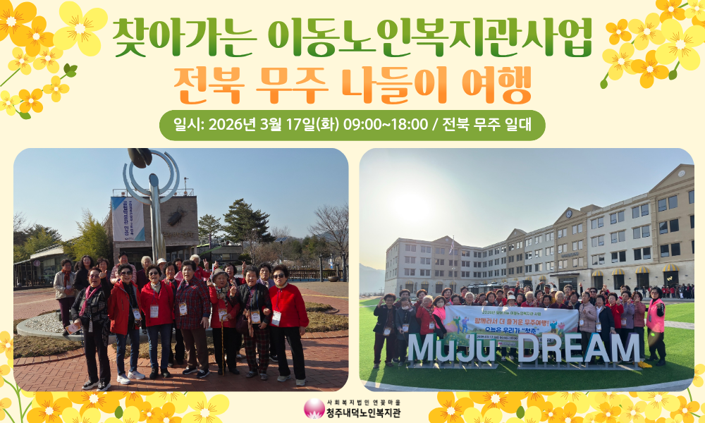 2026년 청주내덕노인복지관은 2026년 희망나눔프로젝트 어르신 나들이 여행 사업에 선정됨에 따라 2026년 찾아가는이동노인복지관 사업과 연계하여 3월17일 화요일 9시 전북 무주 나들이 여행을 다녀왔습니다.