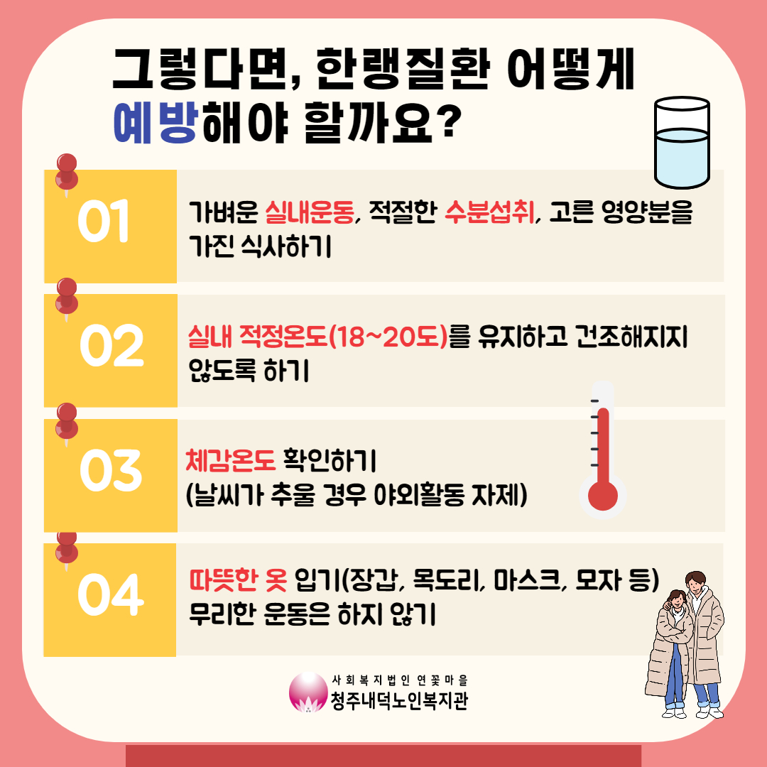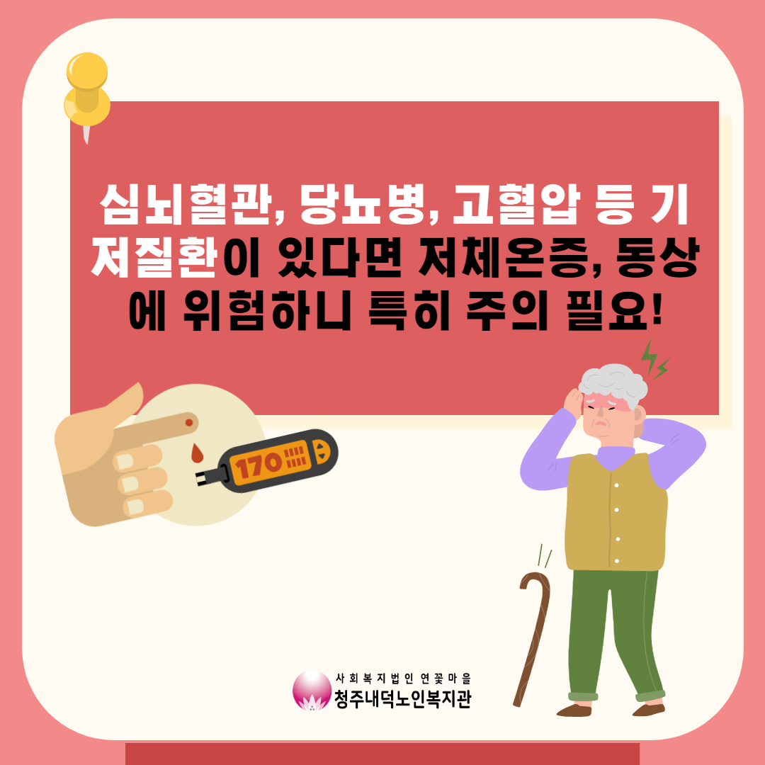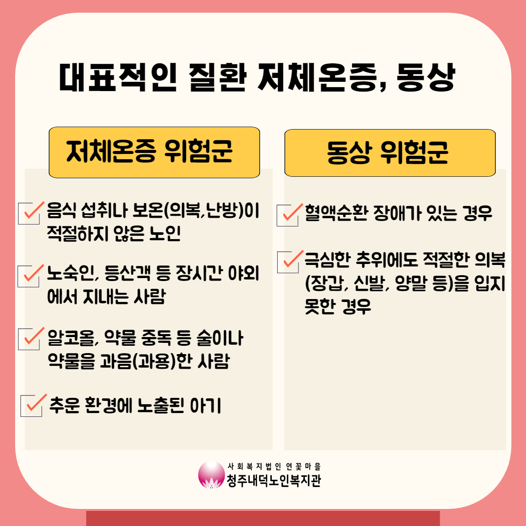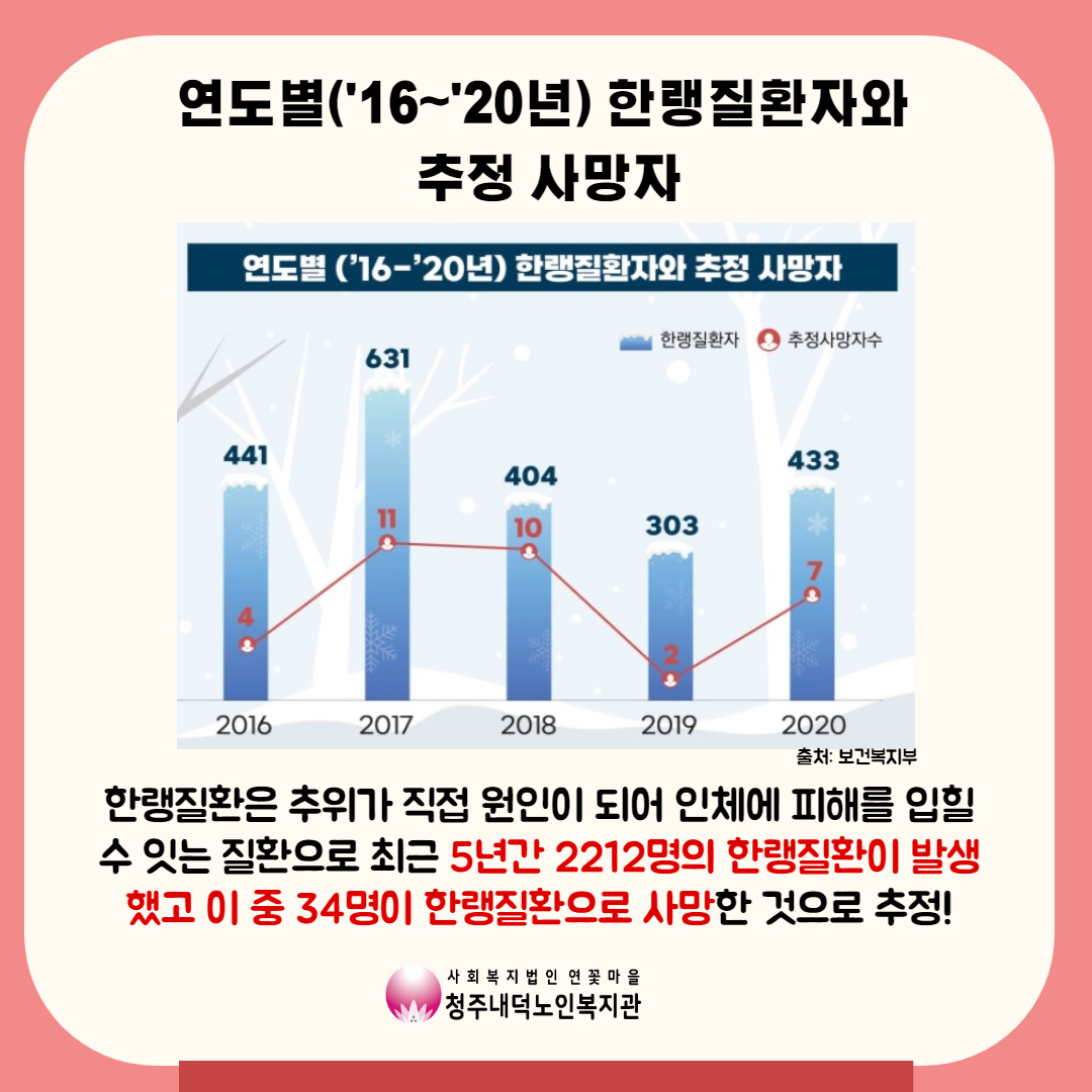 매월 찾아오는 복지관 건강정보! 작년 12월부터 갑자기 기온이 뚝 떨어지는 날이 늘어나고 있습니다. 기상청에 의하면 올겨울은 기온의 변화가 크게 있을 것이라고 하는데요, 기온이 변화가 클수록 면역력 감소에 의해 질병 및 한랭질환에 노출될 가능성이 높아 더욱 주의가 필요합니다!