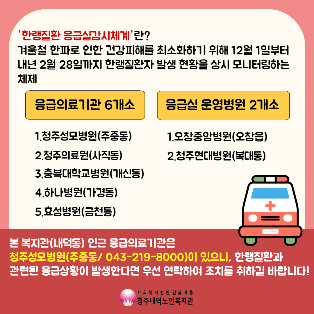 매년 12월부터 2월까지는 질병관리청에서 한랭질환 발생 현황 감시를 진행하며 주의가 더욱 필요한 시기입니다. 기온이 영하로 떨어지는 날에는 외출을 삼가고 과격한 실외활동을 자제하는 것이 좋습니다. 이번 청주시에서도 응급실감시체제를 운영하여 한랭질환과 관련된 응급환자들을 수시로 모니터링하고 감시하기로 했는데요! 이번 내용 참고하여 내 주변 응급의료기관과 응급실 운영 병원이 어딘지 알아보고, 이번 겨울철 한랭질환에 주의하여 안전하고 따뜻한 겨울 보내시기 바랍니다! |